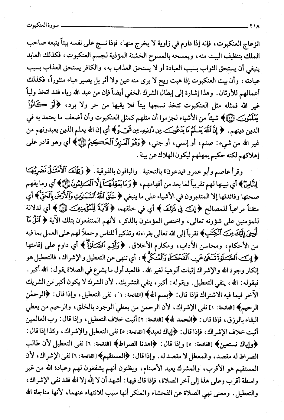 وَإِيَّاكَ نَسْتَعِينُ [الفاتحة: 5] وإذا قال: اهْدِنَا الصِّراطَ [الفاتحة: 6] نفى التعطيل لأن طالب الصراط له مقصد، والمعطل لا مقصد له. وإذا قال: الْمُسْتَقِيمَ [الفاتحة: 6] نفى التعطيل لأن طالب المستقيم هو الأقرب، والمشرك يعبد الأصنام، ويظنون أنهم يشفعون لهم وعبادة الله من غير واسطة أقرب وعلى هذا إلى آخر الصلاة، فإذا قال فيها: أشهد أن لا إله إلا الله فقد نفى الإشراك، والتعطيل. ومعنى نهي الصلاة عن الفحشاء والمنكر أنها سبب للانتهاء عنهما، لأنها مناجاة الله