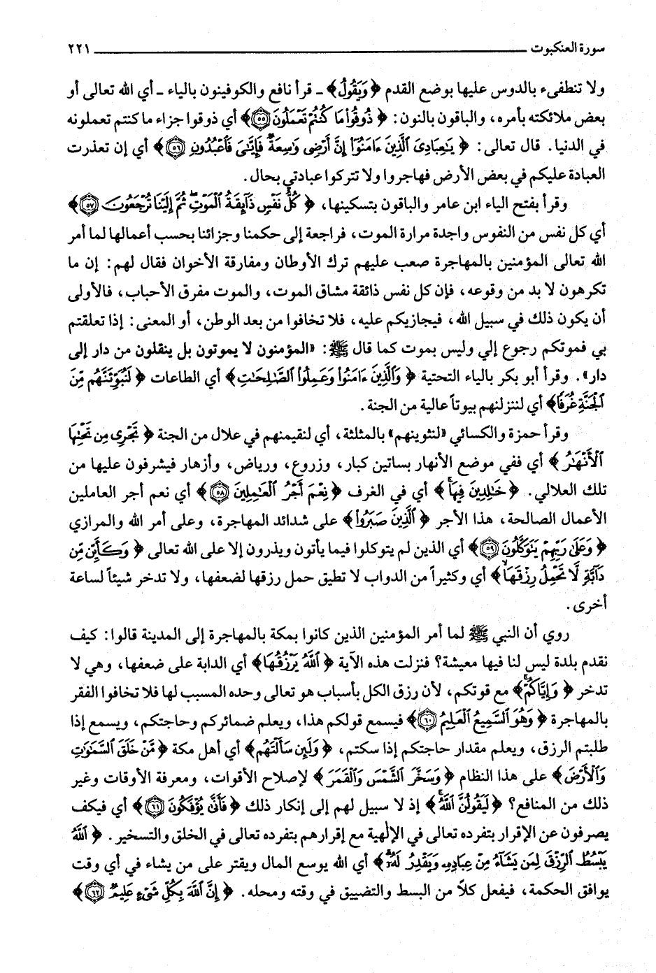 وقرأ بفتح الياء ابن عامر والباقون بتسكينها، كُلُّ نَفْسٍ ذائِقَةُ الْمَوْتِ ثُمَّ إِلَيْنا تُرْجَعُونَ (57) أي كل نفس من النفوس واجدة مرارة الموت، فراجعة إلى حكمنا وجزائنا بحسب أعمالها لما أمر الله تعالى المؤمنين بالمهاجرة صعب عليهم ترك الأوطان ومفارقة الأخوان فقال لهم: إن ما تكرهون لا بد من وقوعه، فإن كل نفس ذائقة مشاق