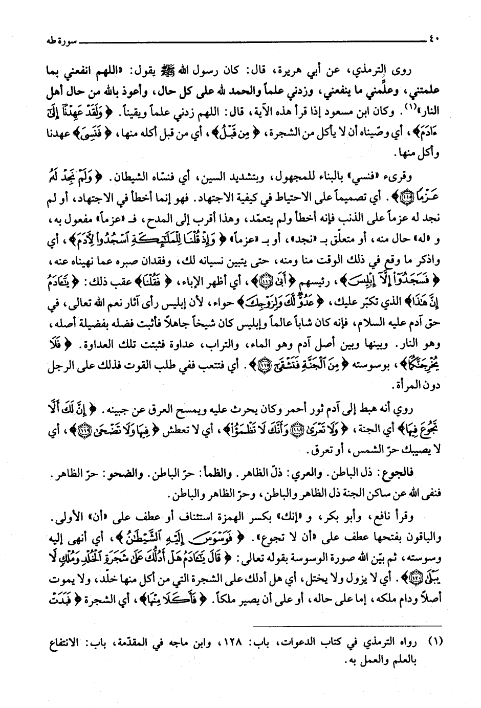 «1» . وكان ابن مسعود إذا قرأ هذه الآية، قال: اللهم زدني علما ويقينا. وَلَقَدْ عَهِدْنا إِلى آدَمَ، أي وصّيناه أن لا يأكل من الشجرة، مِنْ قَبْلُ، أي من قبل أكله منها، فَنَسِيَ عهدنا وأكل منها.