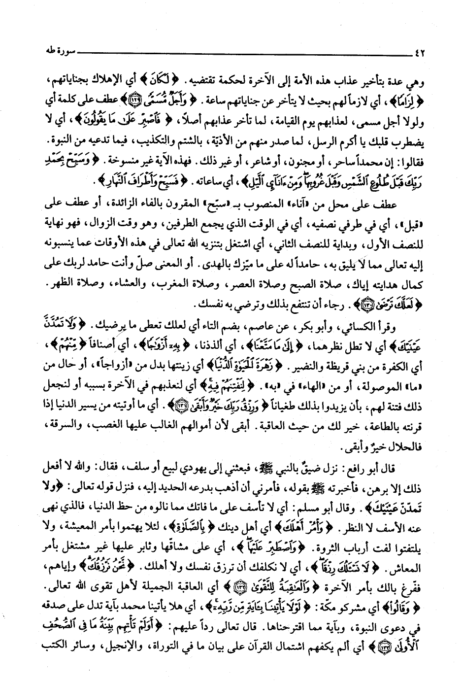 وهي عدة بتأخير عذاب هذه الأمة إلى الآخرة لحكمة تقتضيه. لَكانَ أي الإهلاك بجناياتهم، لِزاماً، أي لازما لهم بحيث لا يتأخر عن جناياتهم ساعة. وَأَجَلٌ مُسَمًّى (129) عطف على كلمة أي ولولا أجل مسمى، لعذابهم يوم القيامة، لما تأخر عذابهم أصلا، فَاصْبِرْ عَلى ما يَقُولُونَ، أي لا يضطرب قلبك يا أكرم الرسل، لما صدر منهم من الأذيّة، بالشتم والتكذيب، فيما تدعيه من النبوة.