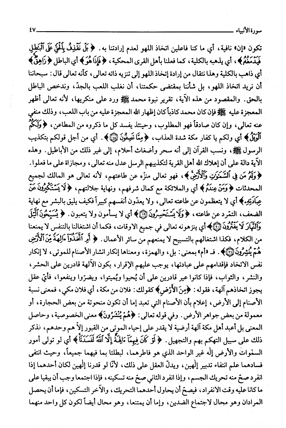 أَمِ اتَّخَذُوا آلِهَةً مِنَ الْأَرْضِ هُمْ يُنْشِرُونَ (21) . ف «أم» بمعنى: بل، والهمزة، ومعناها إنكار انشار الأصنام للموتى، لا إنكار نفس الاتخاد فإقدامهم على عبادتها، يوجب عليهم الإقرار، بكون الآلهة قادرين على الحشر، والنشر، والثواب، فإذا كانوا عير قادرين على أن يحيوا ويميتوا، ويضرّوا وينفعوا، فأيّ عقل يجوز اتخاذهم آلهة، فقوله: مِنَ الْأَرْضِ كقولك: فلان من مكة، أي فلان مكي، فمعنى نسبة الأصنام إلى الأرض، إعلام بأن الأصنام التي تعبد إما أن تكون منحوتة من بعض الحجارة، أو معمولة من بعض جواهر الأرض. وفي قوله تعالى: هُمْ يُنْشِرُونَ معنى الخصوصية، وحاصل المعنى بل أعبد أهل مكة آلهة أرضية لا يقدر على إحياء الموتى من القبور إلّا هم وحدهم، فذكر ذلك على سبيل التهكم بهم والتجهيل. لَوْ كانَ فِيهِما آلِهَةٌ إِلَّا اللَّهُ لَفَسَدَتا أي لو تولى أمور السموات والأرض إله غير الواحد الذي هو فاطرهما، لبطلتا بما فيهما جميعا، وحيث انتفى فسادهما علم انتفاء تدبير إلهين، ويدلّ العقل على ذلك، لأنّا لو قدرنا إليهن لكان أحدهما إذا انفرد صحّ منه تحريك الجسم، وإذا انفرد الثاني صحّ منه تسكينه، فإذا اجتمعا وجب أن يبقيا على ما كانا عليه وقت الانفراد، فيصحّ أن يحاول أحدهما التحريك، والآخر التسكين، فإما أن يحصل المرادان وهو محال لاجتماع الضدين، وإما أن يمتنعا، وهو محال أيضا لكون كل واحد منهما
