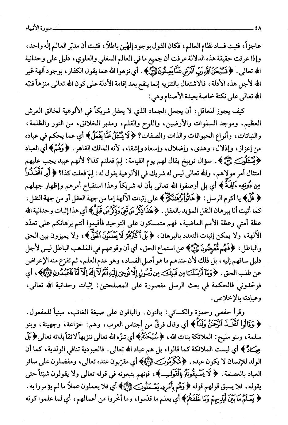 كيف يجوز للعاقل، أن يجعل الجماد الذي لا يعقل شريكا في الألوهية لخالق العرش العظيم، وموجد السموات والأرضين، واللوح والقلم، ومدبر الخلائق، من النور والظلمة، والنباتات، وأنواع الحيوانات والذات والصفات؟ لا يُسْئَلُ عَمَّا يَفْعَلُ أي عما يحكم في عباده من إعزاز، وإذلال، وهدى، وإضلال، وإسعاد وإشقاء، لأنه المالك القاهر. وَهُمْ أي العباد يُسْئَلُونَ (23) . سؤال توبيخ يقال لهم يوم القيامة: لم فعلتم كذا؟ لأنهم عبيد يجب عليهم امتثال أمر مولاهم، والله تعالى ليس له شريك في الألوهية يقول له: لم فعلت كذا؟ أَمِ اتَّخَذُوا مِنْ دُونِهِ آلِهَةً أي بل أوصفوا الله تعالى بأن له شريكا وهذا استقباح أمرهم وإظهار جهلهم قُلْ يا أكرم الرسل: هاتُوا بُرْهانَكُمْ على إثبات الآلهة إما من جهة العقل أو من جهة النقل، كما أتيت أنا ببرهان النقل المؤيد بالعقل. هذا ذِكْرُ مَنْ مَعِيَ وَذِكْرُ مَنْ قَبْلِي أي هذا إثبات وحدانية الله عظة أمتي وعظة الأمم الماضية، فهم متمسكون على التوحيد فأقيموا أنتم برهانكم على تعدّد الآلهة، ولا يمكن إثبات التعدد بالبرهان، بَلْ أَكْثَرُهُمْ لا يَعْلَمُونَ الْحَقَّ، ولا يميزون بين الحق والباطل، فَهُمْ مُعْرِضُونَ (24) عن استماع الحق، أي أن وقوعهم في المذهب الباطل ليس لأجل دليل ساقهم إليه، بل ذلك لأن عندهم ما هو أصل الفساد، وهو عدم العلم، ثم تفرّع منه الإعراض عن طلب الحق. وَما أَرْسَلْنا مِنْ قَبْلِكَ مِنْ رَسُولٍ إِلَّا نُوحِي إِلَيْهِ أَنَّهُ لا إِلهَ إِلَّا أَنَا فَاعْبُدُونِ (25) ، أي فوحّدوني فالحكمة في بعث الرسل مقصورة على المصلحتين: إثبات وحدانية الله تعالى، وعبادته بالإخلاص.