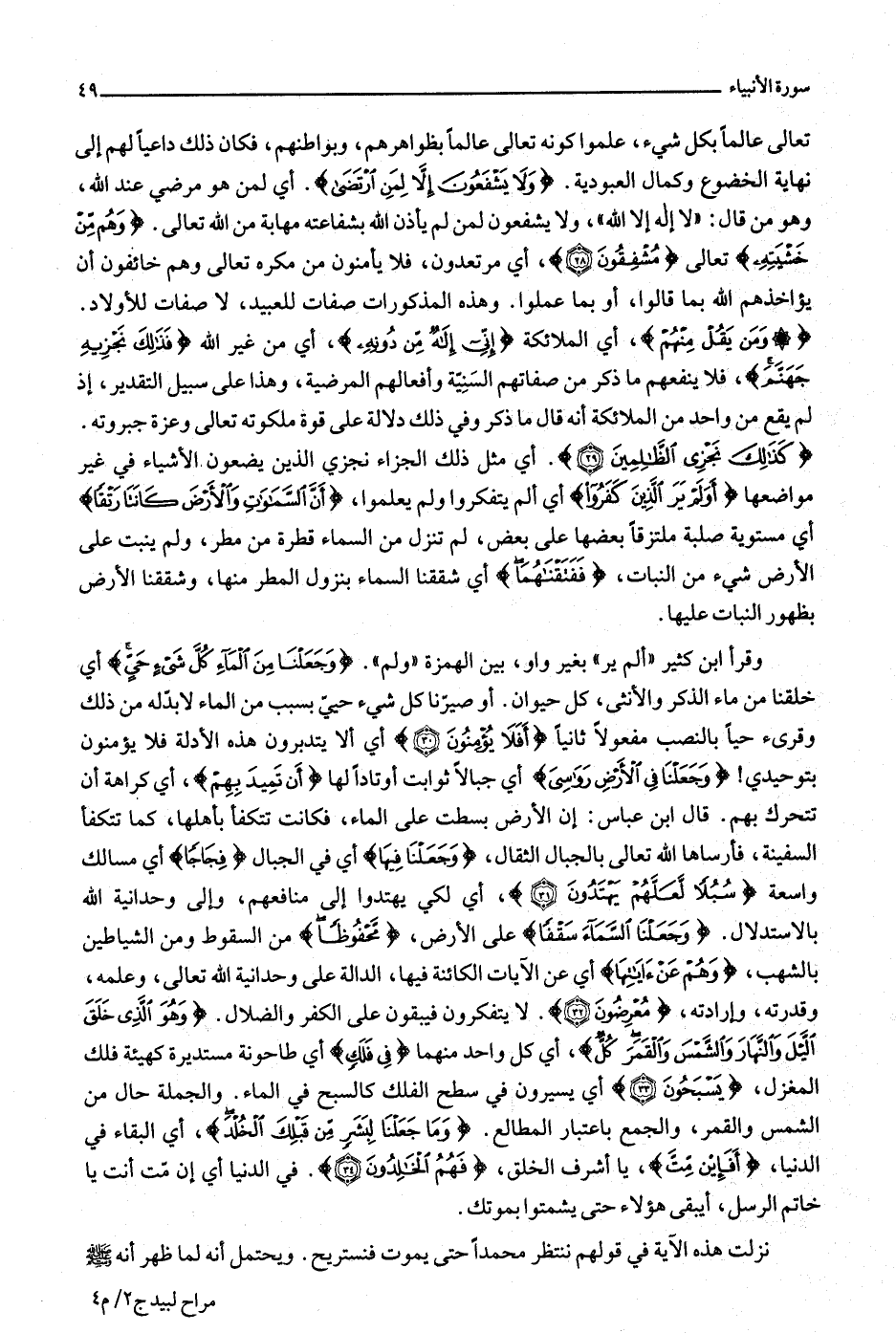 وَجَعَلْنا فِي الْأَرْضِ رَواسِيَ أي جبالا ثوابت أوتادا لها أَنْ تَمِيدَ بِهِمْ، أي كراهة أن تتحرك بهم. قال ابن عباس: إن الأرض بسطت على الماء، فكانت تتكفأ بأهلها، كما تتكفأ السفينة، فأرساها الله تعالى بالجبال الثقال، وَجَعَلْنا فِيها أي في الجبال فِجاجاً أي مسالك واسعة سُبُلًا لَعَلَّهُمْ يَهْتَدُونَ (31) ، أي لكي يهتدوا إلى منافعهم، وإلى وحدانية الله بالاستدلال. وَجَعَلْنَا السَّماءَ سَقْفاً على الأرض، مَحْفُوظاً من السقوط ومن الشياطين بالشهب، وَهُمْ عَنْ آياتِها أي عن الآيات الكائنة فيها، الدالة على وحدانية الله تعالى، وعلمه، وقدرته، وإرادته، مُعْرِضُونَ (32) . لا يتفكرون فيبقون على الكفر والضلال. وَهُوَ الَّذِي خَلَقَ اللَّيْلَ وَالنَّهارَ وَالشَّمْسَ وَالْقَمَرَ كُلٌّ، أي كل واحد منهما فِي فَلَكٍ أي طاحونة مستديرة كهيئة فلك المغزل، يَسْبَحُونَ (33) أي يسيرون في سطح الفلك كالسبح في الماء. والجملة حال من الشمس والقمر، والجمع باعتبار المطالع. وَما جَعَلْنا لِبَشَرٍ مِنْ قَبْلِكَ الْخُلْدَ، أي البقاء في الدنيا، أَفَإِنْ مِتَّ، يا أشرف الخلق، فَهُمُ الْخالِدُونَ (34) . في الدنيا أي إن متّ أنت يا خاتم الرسل، أيبقى هؤلاء حتى يشمتوا بموتك.