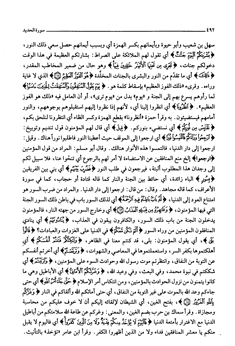 ارجعوا إلى دار الدنيا، فالتمسوا هذه الأنوار هنالك. وقال أبو مسلم: المراد من قول المؤمنين ارْجِعُوا إلخ منع المنافقين عن الاستضاءة لا أمر لهم بالرجوع أي تنحّوا عنا، فلا سبيل لكم إلى وجدان هذا المطلوب ألبتة، فيرجعون في طلب النور فَضُرِبَ بَيْنَهُمْ أي بني بين الفريقين بِسُورٍ الباء زائدة، أي حائط بين الجنة والنار كما قاله قتادة أو حجاب، كما في سورة الأعراف، كما قاله مجاهد. وقال: من قال: ارجعوا إلى دار الدنيا. والمراد من ضرب السور هو امتناع العود إلى الدنيا، لَهُ بابٌ باطِنُهُ فِيهِ الرَّحْمَةُ أي لذلك السور باب في باطن ذلك السور الجنة التي فيها المؤمنون، وَظاهِرُهُ مِنْ قِبَلِهِ الْعَذابُ (13) أي وخارج السور من جهته النار، فالمؤمنون يدخلون الجنة من باب ذلك السور، والكافرون يبقون في العذاب، يُنادُونَهُمْ أي ينادي المنافقون المؤمنين من وراء السور أَلَمْ نَكُنْ مَعَكُمْ في الدنيا على الغزوات والعبادات؟ قالُوا بَلى، أي يقول المؤمنون: بلى، قد كنتم معنا في الظاهر، وَلكِنَّكُمْ فَتَنْتُمْ أَنْفُسَكُمْ أي أهلكتموها بكفر السر، واستعملتموها في المعاصي والشهوات، وَتَرَبَّصْتُمْ أي أخرتم أنفسكم عن التوبة من النفاق، وانتظرتم موت رسول الله وحوادث السوء على المؤمنين، وَارْتَبْتُمْ أي شككتم في نبوة محمد، وفي البعث، وفي وعيد الله، وَغَرَّتْكُمُ الْأَمانِيُّ أي الأباطيل وهي ما كانوا يتمنون من نزول الحوادث بالمؤمنين، ومن انتكاس أمر الإسلام حَتَّى جاءَ أَمْرُ اللَّهِ أي حتى جاءكم وعد الله بالموت على غير التوبة من النفاق، أي حتى أماتكم الله وألقاكم في النار وَغَرَّكُمْ بِاللَّهِ الْغَرُورُ (14) ، بفتح الغين، أي الشيطان لإلقائه إليكم أن لا خوف عليكم من محاسبة ومجازاة. وقرأ سماك بن حرب بضم الغين، والمعنى: وغركم عن طاعة الله سلامتكم من أباطيل الدنيا مع الاغترار بأمتعة الدنيا فَالْيَوْمَ لا يُؤْخَذُ مِنْكُمْ فِدْيَةٌ وَلا مِنَ الَّذِينَ كَفَرُوا أي فاليوم لا يقبل منكم يا معشر المنافقين فداء ولا من الذين أظهروا الكفر. وقرأ ابن عامر «تؤخذ» بالتأنيث.