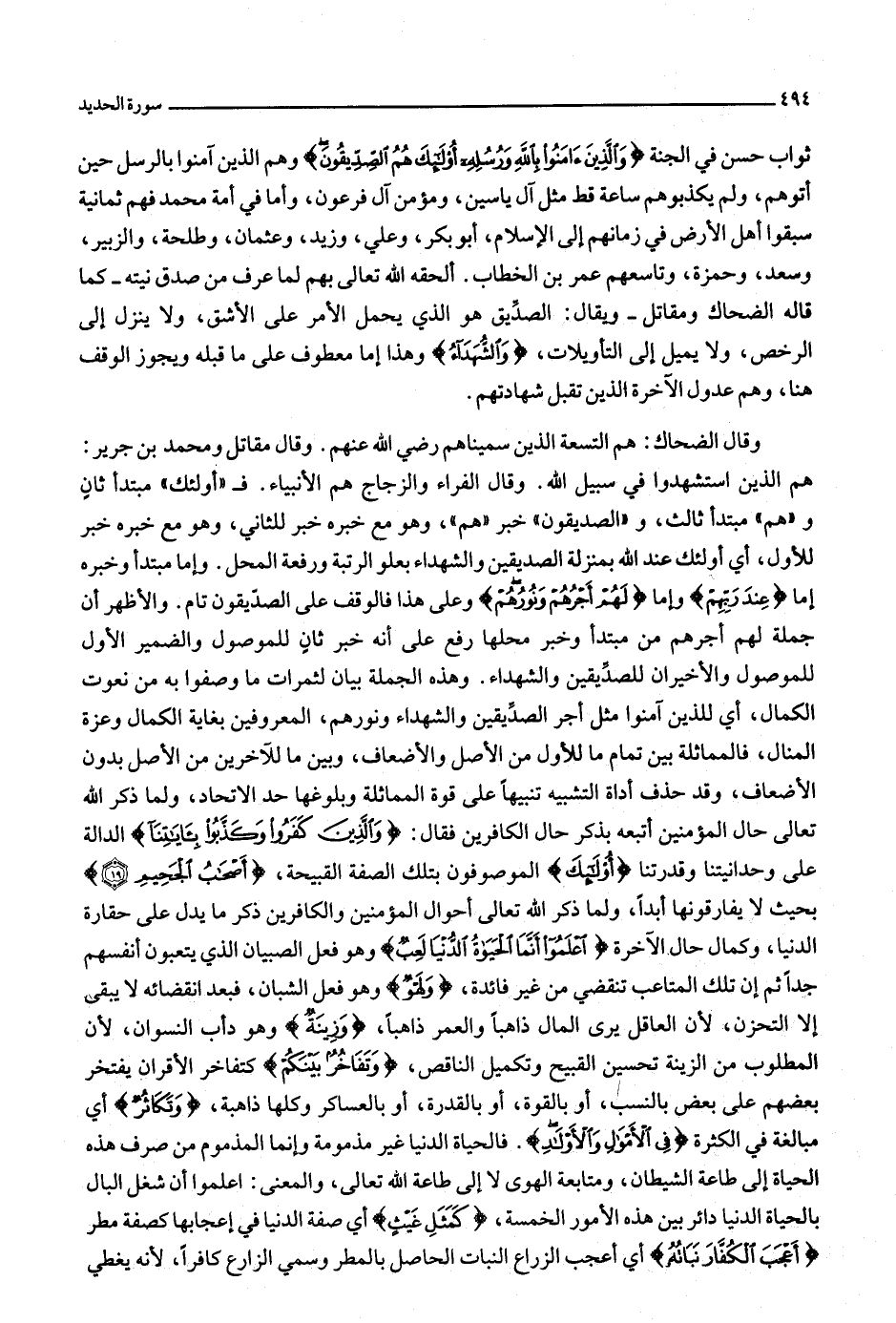 هم الذين استشهدوا في سبيل الله. وقال الفراء والزجاج هم الأنبياء. ف «أولئك» مبتدأ ثان و «هم» مبتدأ ثالث، و «الصديقون» خبر «هم» ، وهو مع خبره خبر للثاني، وهو مع خبره خبر للأول، أي أولئك عند الله بمنزلة الصديقين والشهداء بعلو الرتبة ورفعة المحل. وإما مبتدأ وخبره إما عِنْدَ رَبِّهِمْ وإما لَهُمْ أَجْرُهُمْ وَنُورُهُمْ وعلى هذا فالوقف على الصدّيقون تام. والأظهر أن جملة لهم أجرهم من مبتدأ وخبر محلها رفع على أنه خبر ثان للموصول والضمير الأول للموصول والأخيران للصدّيقين والشهداء. وهذه الجملة بيان لثمرات ما وصفوا به من نعوت الكمال، أي للذين آمنوا مثل أجر الصدّيقين والشهداء ونورهم، المعروفين بغاية الكمال وعزة المنال، فالمماثلة بين تمام ما للأول من الأصل والأضعاف، وبين ما للآخرين من الأصل بدون الأضعاف، وقد حذف أداة التشبيه تنبيها على قوة المماثلة وبلوغها حد الاتحاد،