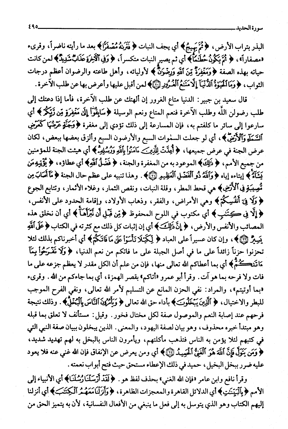 سابِقُوا إِلى مَغْفِرَةٍ مِنْ رَبِّكُمْ أي سارعوا إلى سائر ما كلفتم به، فإن المسارعة إلى ذلك تؤدي إلى مغفرة وَجَنَّةٍ عَرْضُها كَعَرْضِ السَّماءِ وَالْأَرْضِ، أي لو جعلت السموات السبع والأرضون السبع وألزق بعضها ببعض، لكان عرض الجنة في عرض جميعها، أُعِدَّتْ لِلَّذِينَ آمَنُوا بِاللَّهِ وَرُسُلِهِ أي هيئت الجنة للمؤمنين من جميع الأمم، ذلِكَ الموعود به من المغفرة والجنة، فَضْلُ اللَّهِ أي عطاؤه، يُؤْتِيهِ مَنْ يَشاءُ إيتاءه إياه وَاللَّهُ ذُو الْفَضْلِ الْعَظِيمِ (21) . وهذا تنبيه على عظم حال الجنة ما أَصابَ مِنْ مُصِيبَةٍ فِي الْأَرْضِ هي قحط المطر، وقلة النبات، ونقص الثمار، وغلاء الأثمار، وتتابع الجوع وَلا فِي أَنْفُسِكُمْ وهي الأمراض، والفقر، وذهاب الأولاد، وإقامة الحدود على الأنفس، إِلَّا فِي كِتابٍ أي مكتوب في اللوح المحفوظ مِنْ قَبْلِ أَنْ نَبْرَأَها أي أن نخلق هذه المصائب والأنفس والأرض، إِنَّ ذلِكَ أي إن إثبات كل ذلك مع كثرته في الكتاب عَلَى اللَّهِ يَسِيرٌ (22) ، وإن كان عسيرا على العباد لِكَيْلا تَأْسَوْا عَلى ما فاتَكُمْ أي أخبرناكم بذلك لئلا تحزنوا حزنا زائدا على ما في أصل الجبلة على ما فاتكم من نعم الدنيا، وَلا تَفْرَحُوا بِما آتاكُمْ أي بما أعطاكم الله تعالى منها، فإن من علم أن الكل مقدر لا يعظم جزعه على ما فات ولا فرحه بما هو آت. وقرأ أبو عمرو «أتاكم» بقصر الهمزة، أي بما جاءكم من الله. وقرئ «بما أوتيتم» ، والمراد: نفي الحزن المانع عن التسليم لأمر الله تعالى، ونفي الفرح الموجب للبطر والاختيال، الَّذِينَ يَبْخَلُونَ بأداء حق الله تعالى وَيَأْمُرُونَ النَّاسَ بِالْبُخْلِ. وذلك نتيجة فرحهم عند إصابة النعم والموصول صفة لكل مختال فخور. وقيل: مستأنف لا تعلق بما قبله وهو مبتدأ خبره محذوف، وهو بيان لصفة اليهود، والمعنى. الذين يبخلون ببيان صفة النبي التي في كتبهم لئلا يؤمن به الناس فتذهب مأكلتهم، ويأمرون الناس بالبخل به لهم تهديد شديد، وَمَنْ يَتَوَلَّ فَإِنَّ اللَّهَ هُوَ الْغَنِيُّ الْحَمِيدُ (24) أي ومن يعرض عن الإنفاق فإن الله غني عنه فلا يعود عليه ضرر ببخل البخيل، حميد في ذلك الإعطاء مستحق حيث فتح أبواب نعمته.
