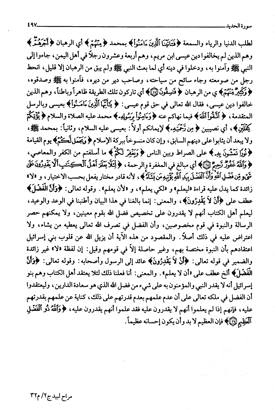 لطلب الدنيا والرياء والسمعة فَآتَيْنَا الَّذِينَ آمَنُوا بمحمد مِنْهُمْ أي الرهبان أَجْرَهُمْ وهم الذين لم يخالفوا دين عيسى ابن مريم، وهم أربعة وعشرون رجلا في أهل اليمن، جاءوا إلى النبي صلّى الله عليه وسلّم وآمنوا به، ودخلوا في دينه أي لما بعث النبي صلّى الله عليه وسلّم ولم يبق من الرهبان إلا قليل، انحط رجل من صومعته وجاء سائح من سياحته، وصاحب دير من ديره، فآمنوا به صلّى الله عليه وسلّم وصدقوه، وَكَثِيرٌ مِنْهُمْ ي من الرهبان فاسِقُونَ (27) أي تاركون تلك الطريقة ظاهرا وباطنا، وهم الذين خالفوا دين عيسى، فقال الله تعالى في حق قوم عيسى: يا أَيُّهَا الَّذِينَ آمَنُوا بعيسى وبالرسل المتقدمة، اتَّقُوا اللَّهَ فيما نهاكم عنه وَآمِنُوا بِرَسُولِهِ محمد عليه الصلاة والسلام يُؤْتِكُمْ كِفْلَيْنِ، أي نصيبين مِنْ رَحْمَتِهِ لإيمانكم أولا: بعيسى عليه السلام، وثانيا: بمحمد صلّى الله عليه وسلّم، ولا يبعد أن يثابوا على دينهم السابق، وإن كان منسوخا ببركة الإسلام وَيَجْعَلْ لَكُمْ يوم القيامة نُوراً تَمْشُونَ بِهِ على الصراط وبين الناس وَيَغْفِرْ لَكُمْ ما أسلفتم من الكفر والمعاصي، وَاللَّهُ غَفُورٌ رَحِيمٌ (28) أي مبالغ في المغفرة والرحمة، لِئَلَّا يَعْلَمَ أَهْلُ الْكِتابِ أَلَّا يَقْدِرُونَ عَلى شَيْءٍ مِنْ فَضْلِ اللَّهِ وَأَنَّ الْفَضْلَ بِيَدِ اللَّهِ يُؤْتِيهِ مَنْ يَشاءُ، لأنه قادر مختار يفعل بحسب الاختيار، و «لا» زائدة كما يدل عليه قراءة «ليعلم» و «لكي يعلم» ، و «لأن يعلم» . وقوله تعالى: وَأَنَّ الْفَضْلَ عطف على أَلَّا يَقْدِرُونَ، والمعنى: إنما بالغنا في هذا البيان وأطنبنا في الوعد والوعيد، ليعلم أهل الكتاب أنهم لا يقدرون على تخصيص فضل الله بقوم معينين، ولا يمكنهم حصر الرسالة والنبوة في قوم مخصوصين، وأن الفضل في تصرف الله تعالى يعطيه من يشاء، ولا اعتراض عليه في ذلك أصلا. والمقصود من هذه الآية أن يزيل الله عن قلوب بني إسرائيل اعتقادهم بأن النبوة مختصة بهم، وغير حاصلة إلّا في قومهم وقيل: إن لفظة «لا» غير زائدة والضمير في قوله تعالى: أَلَّا يَقْدِرُونَ عائد إلى الرسول وأصحابه: وقوله تعالى: وَأَنَّ الْفَضْلَ ألخ عطف على «أن لا يعلم» . والمعنى: أنا فعلنا ذلك لئلا يعتقد أهل الكتاب وهم بنو إسرائيل أنه لا يقدر النبي والمؤمنون به على شيء من فضل الله الذي هو سعادة الدارين، وليعتقدوا أن الفضل في ملكه تعالى على أن عدم علمهم بعدم قدرتهم على ذلك، كناية عن علمهم بقدرتهم عليه، فإنهم إذا لم يعلموا أنهم لا يقدرون عليه فقد علموا أنهم يقدرون عليه، وَاللَّهُ ذُو الْفَضْلِ الْعَظِيمِ (29) فإن العظيم لا بد وأن يكون إحسانه عظيما.