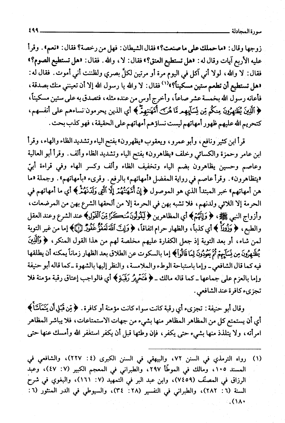 قرأ ابن كثير ونافع، وأبو عمرو، ويعقوب «يظهرون» بفتح الياء وتشديد الظاء والهاء، وقرأ ابن عامر وحمزة والكسائي وخلف «يظاهرون» بفتح الياء وتشديد الظاء وألف. وقرأ أبو العالية وعاصم وحسين يظاهرون بضم الياء وتخفيف الظاء وألف وكسر الهاء وفي قراءة أبيّ «يتظاهرون» . وقرأ عاصم في رواية المفضل «أمهاتهم» بالرفع. وقرئ «بأمهاتهم» . وجملة «ما هن أمهاتهم» خبر المبتدأ الذي هو الموصول إِنْ أُمَّهاتُهُمْ إِلَّا اللَّائِي وَلَدْنَهُمْ أي ما أمهاتهم في الحرمة إلا اللائي ولدنهم، فلا تشبه بهن في الحرمة إلا من ألحقها الشرع بهن من المرضعات، وأزواج النبي صلّى الله عليه وسلّم، وَإِنَّهُمْ أي المظاهرين لَيَقُولُونَ مُنْكَراً مِنَ الْقَوْلِ عند الشرع وعند العقل والطبع، وَزُوراً أي كذبا، والظهار حرام اتفاقا، وَإِنَّ اللَّهَ لَعَفُوٌّ غَفُورٌ (2) إما من غير التوبة لمن شاء، أو بعد التوبة إذ جعل الكفارة عليهم مخلصة لهم من هذا القول المنكر، وَالَّذِينَ يُظاهِرُونَ مِنْ نِسائِهِمْ ثُمَّ يَعُودُونَ لِما قالُوا إما بالسكوت عن الطلاق بعد الظهار زمانا يمكنه أن يطلقها فيه كما قال الشافعي- وإما باستباحة الوطء والملامسة، والنظر إليها بالشهوة- كما قاله أبو حنيفة وإما بالعزم على جماعها- كما قاله مالك- فَتَحْرِيرُ رَقَبَةٍ أي فالواجب إعتاق رقبة مؤمنة فلا تجزئ كافرة عند الشافعي.