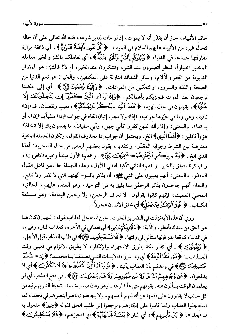 خاتم الأنبياء، جاز أن يقدّر أنه لا يموت، إذ لو مات لتغير شرعه، فنبه الله تعالى على أن حاله كحال غيره من الأنبياء عليهم السلام في الموت. كُلُّ نَفْسٍ ذائِقَةُ الْمَوْتِ، أي ذائقة مرارة مفارقتها جسدها في الدنيا، وَنَبْلُوكُمْ بِالشَّرِّ وَالْخَيْرِ فِتْنَةً، أي نعاملكم بالشرّ والخير معاملة المختبر اختبارا، لننظر أتصبرون عند الشر، وتشكرون عند الخير، أم لا؟ فالشرّ: هو المضار الدنيوية من الفقر والآلام، وسائر الشدائد النازلة على المكلفين، والخير: هو نعم الدنيا من الصحة واللذة والسرور، والتمكين من المرادات. وَإِلَيْنا تُرْجَعُونَ (35) . أي إلى حكمنا ترجعون بعد الموت فنجزيكم بأعمالكم. وَإِذا رَآكَ الَّذِينَ كَفَرُوا إِنْ يَتَّخِذُونَكَ إِلَّا هُزُواً، يقولون في حال الهزء، أَهذَا الَّذِي يَذْكُرُ آلِهَتَكُمْ، بعيب ونقصان. ف «إن» نافية، وهي وما في حيّزها جواب، «إذا» ولا يجب إتيان الفاء في جواب «إذا» منفيا ب «إن» ، أو ب «ما» . والمعنى: وإذا رآك الذين كفروا كأبي جهل، وأبي سفيان، ما يفعلون بك إلا اتخاذك هزوا قائلين: أَهذَا الَّذِي إلخ. ويحتمل أن جواب إذا محذوف القول، وتكون الجملة المنفية معترضة بين الشرط وجوابه المقدّر، والتقدير، يقول بعضهم لبعض في حال السخرية: أهذا الذي إلخ. وَهُمْ بِذِكْرِ الرَّحْمنِ هُمْ كافِرُونَ (36) . و «هم» الأول مبتدأ وخبره «كافرون» ، و «بذكر» متعلق بالخبر. و «هم» الثاني تأكيد لفظي للأول، وهذه الجملة حال من فاعل القول المقدّر. والمعنى: أنهم يعيبون على النبي صلّى الله عليه وسلّم، أن يذكر بالسوء آلهتهم التي لا تضر ولا تنفع.