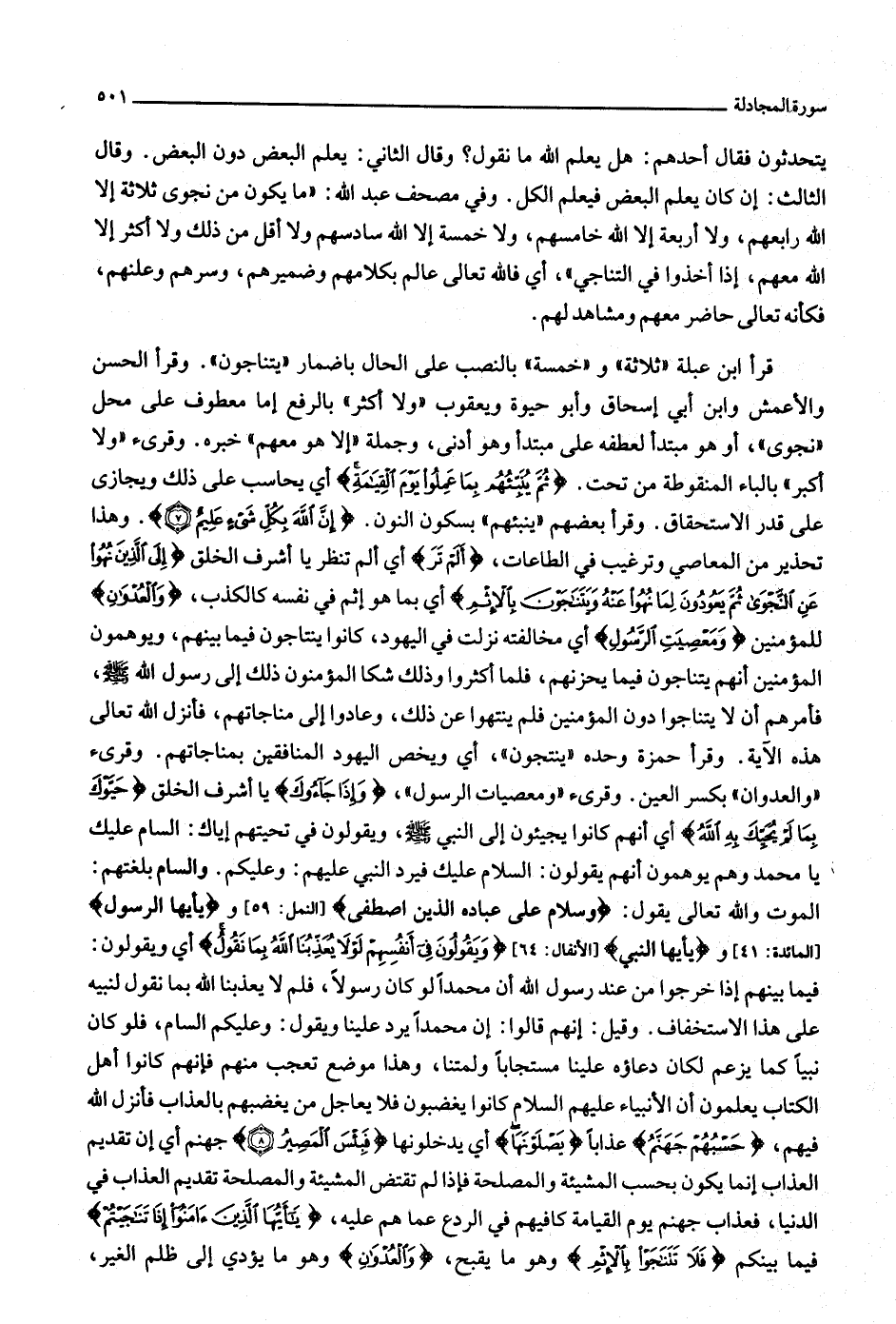 قرأ ابن عبلة «ثلاثة» و «خمسة» بالنصب على الحال بإضمار «يتناجون» . وقرأ الحسن والأعمش وابن أبي إسحاق وأبو حيوة ويعقوب «ولا أكثر» بالرفع إما معطوف على محل «نجوى» ، أو هو مبتدأ لعطفه على مبتدأ وهو أدنى، وجملة «إلا هو معهم» خبره. وقرئ «ولا أكبر» بالباء المنقوطة من تحت. ثُمَّ يُنَبِّئُهُمْ بِما عَمِلُوا يَوْمَ الْقِيامَةِ أي يحاسب على ذلك ويجازى على قدر الاستحقاق. وقرأ بعضهم «ينبئهم» بسكون النون. إِنَّ اللَّهَ بِكُلِّ شَيْءٍ عَلِيمٌ (7) . وهذا تحذير من المعاصي وترغيب في الطاعات، أَلَمْ تَرَ أي ألم تنظر يا أشرف الخلق إِلَى الَّذِينَ نُهُوا عَنِ النَّجْوى ثُمَّ يَعُودُونَ لِما نُهُوا عَنْهُ وَيَتَناجَوْنَ بِالْإِثْمِ أي بما هو إثم في نفسه كالكذب، وَالْعُدْوانِ للمؤمنين وَمَعْصِيَةِ الرَّسُولِ أي مخالفته نزلت في اليهود، كانوا ينتاجون فيما بينهم، ويوهمون المؤمنين أنهم يتناجون فيما يحزنهم، فلما أكثروا وذلك شكا المؤمنون ذلك إلى رسول الله صلّى الله عليه وسلّم، فأمرهم أن لا يتناجوا دون المؤمنين فلم ينتهوا عن ذلك، وعادوا إلى مناجاتهم، فأنزل الله تعالى هذه الآية. وقرأ حمزة وحده «ينتجون» ، أي ويخص اليهود المنافقين بمناجاتهم. وقرئ «والعدوان» بكسر العين. وقرئ «ومعصيات الرسول» ، وَإِذا جاؤُكَ يا أشرف الخلق حَيَّوْكَ بِما لَمْ يُحَيِّكَ بِهِ اللَّهُ أي أنهم كانوا يجيئون إلى النبي صلّى الله عليه وسلّم، ويقولون في تحيتهم إياك: السام عليك يا محمد وهم يوهمون أنهم يقولون: السلام عليك فيرد النبي عليهم: وعليكم. والسام بلغتهم: