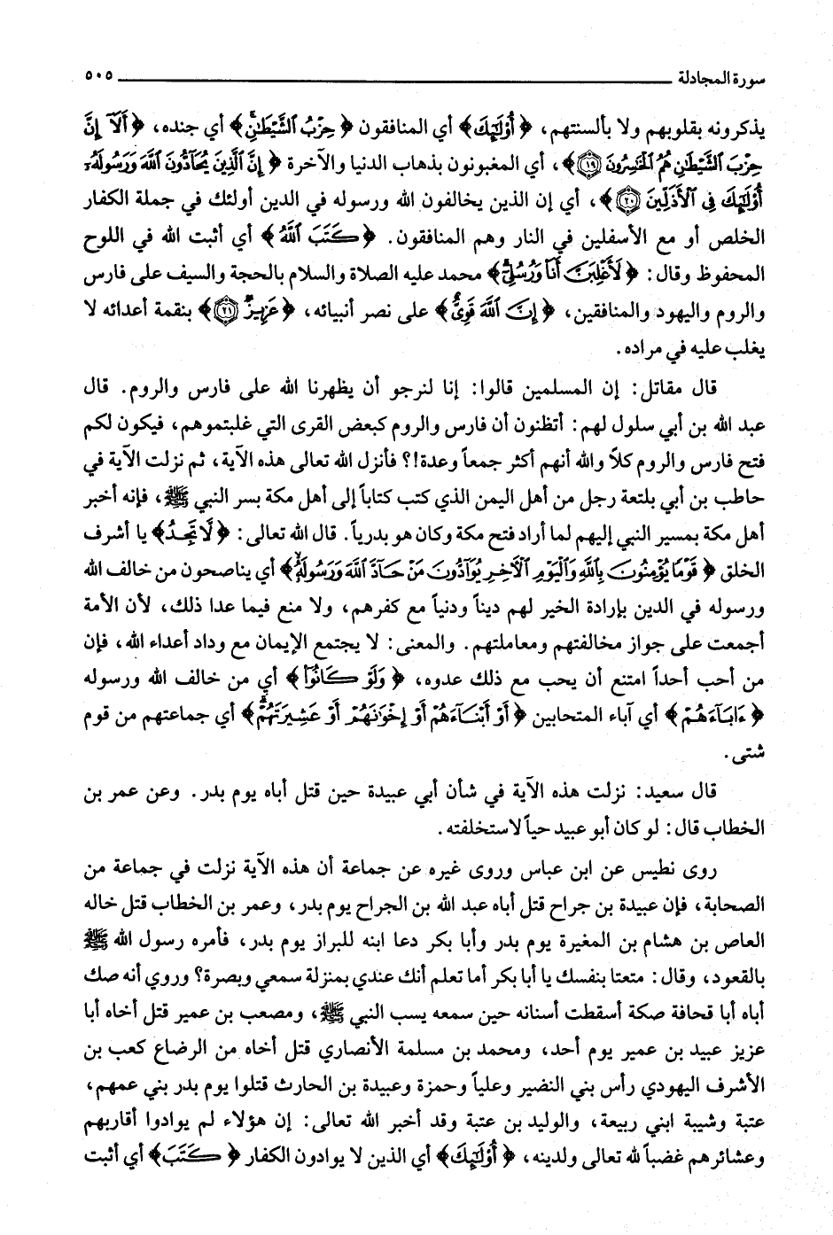 أما تعلم أنك عندي بمنزلة سمعي وبصري؟ وروي أنه صك أباه أبا قحافة صكة أسقطت أسنانه حين سمعه يسب النبي صلّى الله عليه وسلّم، ومصعب بن عمير قتل أخاه أبا عزيز عبيد بن عمير يوم أحد، ومحمد بن مسلمة الأنصاري قتل أخاه من الرضاع كعب بن الأشرف اليهودي رأس بني النضير وعليا وحمزة وعبيدة بن الحارث قتلوا يوم بدر بني عمهم، عتبة وشيبة ابني ربيعة، والوليد بن عتبة وقد أخبر الله تعالى: إن هؤلاء لم يوادوا أقاربهم وعشائرهم غضبا لله تعالى ولدينه، أُولئِكَ أي الذين لا يوادون الكفار كَتَبَ أي أثبت