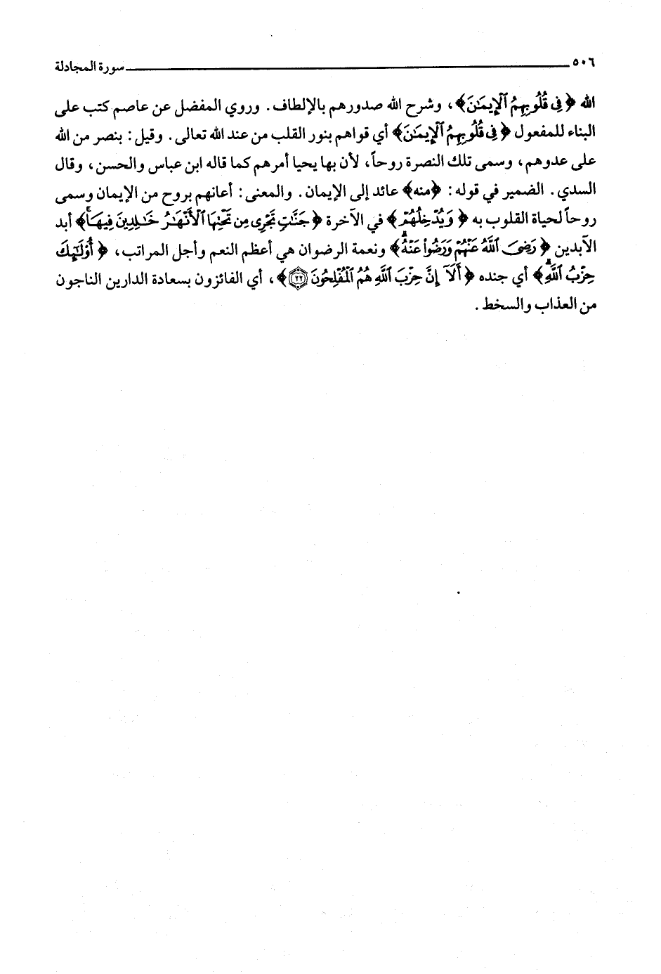 الله فِي قُلُوبِهِمُ الْإِيمانَ، وشرح الله صدورهم بالإلطاف. وروي المفضل عن عاصم كتب على البناء للمفعول فِي قُلُوبِهِمُ الْإِيمانَ أي قواهم بنور القلب من عند الله تعالى. وقيل: بنصر من الله على عدوهم، وسمى تلك النصرة روحا، لأن بها يحيا أمرهم كما قاله ابن عباس والحسن، وقال السدي. الضمير في قوله: مِنْهُ عائد إلى الإيمان. والمعنى: أعانهم بروح من الإيمان وسمى روحا لحياة القلوب به وَيُدْخِلُهُمْ في الآخرة جَنَّاتٍ تَجْرِي مِنْ تَحْتِهَا الْأَنْهارُ خالِدِينَ فِيها أبد الآبدين رَضِيَ اللَّهُ عَنْهُمْ وَرَضُوا عَنْهُ ونعمة الرضوان هي أعظم النعم وأجل المراتب، أُولئِكَ حِزْبُ اللَّهِ أي جنده أَلا إِنَّ حِزْبَ اللَّهِ هُمُ الْمُفْلِحُونَ (22) ، أي الفائزون بسعادة الدارين الناجون من العذاب والسخط.