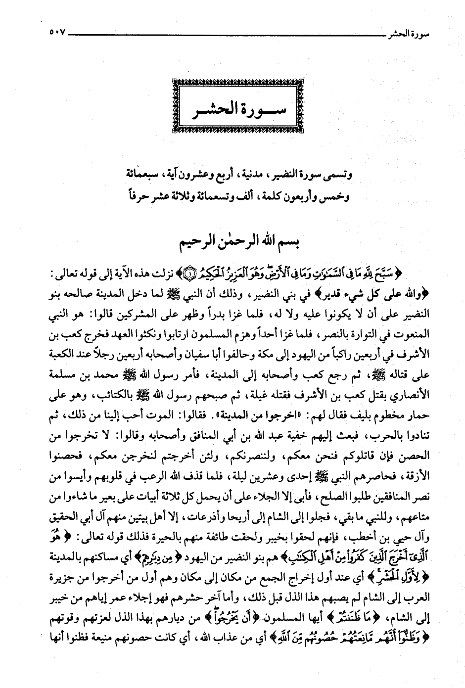وتسمى سورة النضير، مدنية، أربع وعشرون آية، سبعمائة وخمس وأربعون كلمة، ألف وتسعمائة وثلاثة عشر حرفا