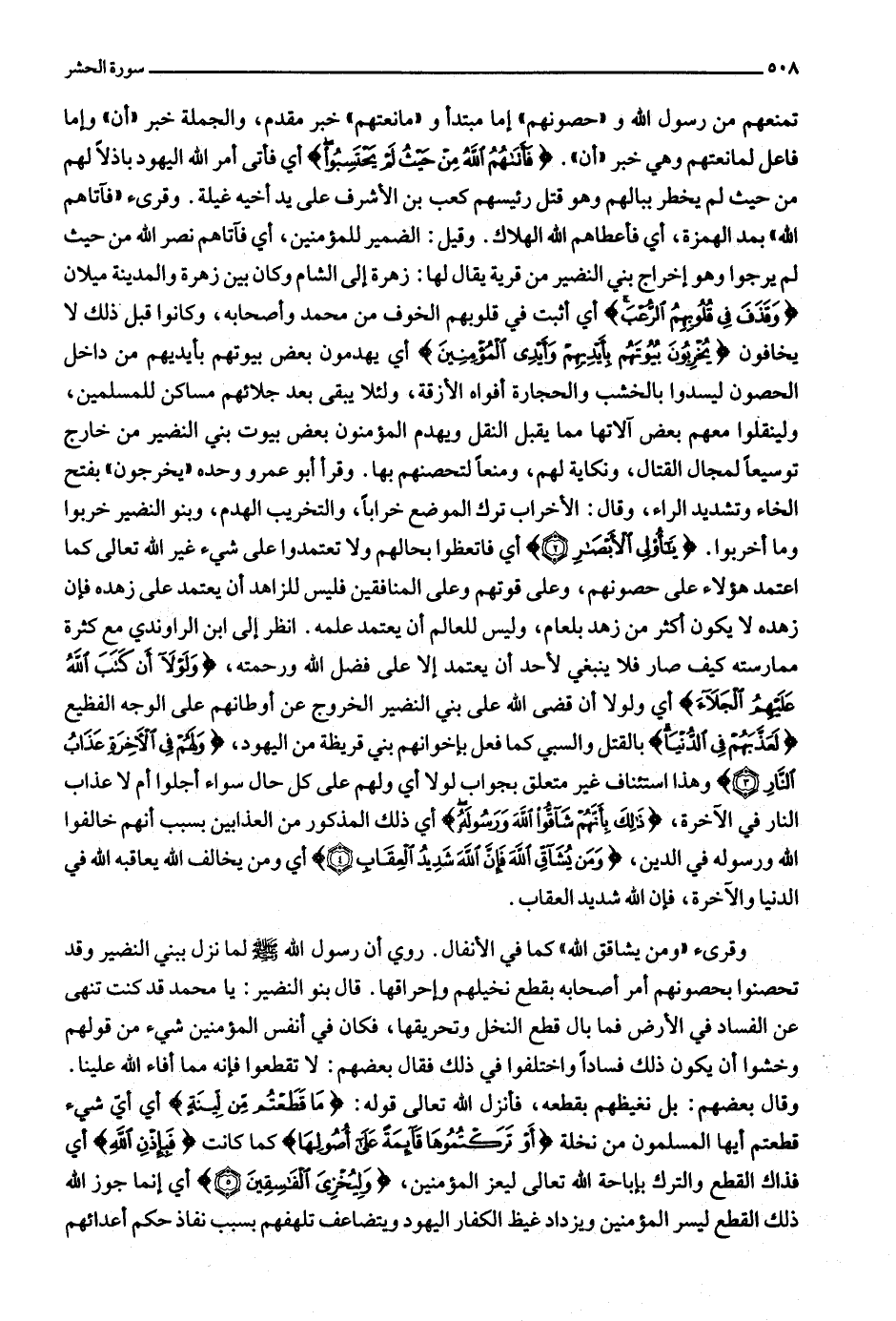 تمنعهم من رسول الله و «حصونهم» إما مبتدأ و «مانعتهم» خبر مقدم، والجملة خبر «أن» وإما فاعل لمانعتهم وهي خبر «أن» . فَأَتاهُمُ اللَّهُ مِنْ حَيْثُ لَمْ يَحْتَسِبُوا أي فأتى أمر الله اليهود باذلا لهم من حيث لم يخطر ببالهم وهو قتل رئيسهم كعب بن الأشرف على يد أخيه غيلة. وقرئ «فآتاهم الله» بمد الهمزة، أي فأعطاهم الله الهلاك. وقيل: الضمير للمؤمنين، أي فآتاهم نصر الله من حيث لم يرجوا وهو إخراج بني النضير من قرية يقال لها: زهرة إلى الشام وكان بين زهرة والمدينة ميلان وَقَذَفَ فِي قُلُوبِهِمُ الرُّعْبَ أي أثبت في قلوبهم الخوف من محمد وأصحابه، وكانوا قبل ذلك لا يخافون يُخْرِبُونَ بُيُوتَهُمْ بِأَيْدِيهِمْ وَأَيْدِي الْمُؤْمِنِينَ أي يهدمون بعض بيوتهم بأيديهم من داخل الحصون ليسدوا بالخشب والحجارة أفواه الأزقة، ولئلا يبقى بعد جلائهم مساكن للمسلمين، ولينقلوا معهم بعض آلاتها مما يقبل النقل ويهدم المؤمنون بعض بيوت بني النضير من خارج توسيعا لمجال القتال، ونكاية لهم، ومنعا لتحصنهم بها. وقرأ أبو عمرو وحده «يخرجون» بفتح الخاء وتشديد الراء، وقال: الأخراب ترك الموضع خرابا، والتخريب الهدم، وبنو النضير خربوا وما أخربوا. يا أُولِي الْأَبْصارِ (2) أي فاتعظوا بحالهم ولا تعتمدوا على شيء غير الله تعالى كما اعتمد هؤلاء على حصونهم، وعلى قوتهم وعلى المنافقين فليس للزاهد أن يعتمد على زهده فإن زهده لا يكون أكثر من زهد بلعام، وليس للعالم أن يعتمد علمه. انظر إلى ابن الراوندي مع كثرة ممارسته كيف صار فلا ينبغي لأحد أن يعتمد إلا على فضل الله ورحمته، وَلَوْلا أَنْ كَتَبَ اللَّهُ عَلَيْهِمُ الْجَلاءَ أي ولولا أن قضى الله على بني النضير الخروج عن أوطانهم على الوجه الفظيع لَعَذَّبَهُمْ فِي الدُّنْيا بالقتل والسبي كما فعل بإخوانهم بني قريظة من اليهود، وَلَهُمْ فِي الْآخِرَةِ عَذابُ النَّارِ (3) وهذا استئناف غير متعلق بجواب لولا أي ولهم على كل حال سواء أجلوا أم لا عذاب النار في الآخرة، ذلِكَ بِأَنَّهُمْ شَاقُّوا اللَّهَ وَرَسُولَهُ أي ذلك المذكور من العذابين بسبب أنهم خالفوا الله ورسوله في الدين، وَمَنْ يُشَاقِّ اللَّهَ فَإِنَّ اللَّهَ شَدِيدُ الْعِقابِ (4) أي ومن يخالف الله يعاقبه الله في الدنيا والآخرة، فإن الله شديد العقاب.
