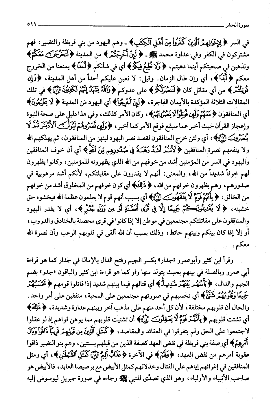 في السر لِإِخْوانِهِمُ الَّذِينَ كَفَرُوا مِنْ أَهْلِ الْكِتابِ- وهم اليهود من بني قريظة والنضير، فهم مشتركون في الكفر وفي عداوة محمد صلّى الله عليه وسلّم- لَئِنْ أُخْرِجْتُمْ من المدينة لَنَخْرُجَنَّ مَعَكُمْ ونذهبن في صحبتكم أينما ذهبتم، وَلا نُطِيعُ فِيكُمْ أي في شأنكم أَحَداً يمنعنا من الخروج معكم أَبَداً، أي وإن طال الزمان. وقيل: لا نعين عليكم أحدا من أهل المدينة، وَإِنْ قُوتِلْتُمْ من أي مقاتل كان لَنَنْصُرَنَّكُمْ على عدوكم وَاللَّهُ يَشْهَدُ إِنَّهُمْ لَكاذِبُونَ (11) في تلك المقالات الثلاثة المؤكدة بالأيمان الفاجرة، لَئِنْ أُخْرِجُوا أي اليهود من المدينة لا يَخْرُجُونَ أي المنافقون مَعَهُمْ وَلَئِنْ قُوتِلُوا لا يَنْصُرُونَهُمْ، وكان الأمر كذلك، وفي هذا دليل على صحة النبوة وإعجاز القرآن حيث أخبر عما سيقع فوقع الأمر كما أخبر، وَلَئِنْ نَصَرُوهُمْ لَيُوَلُّنَّ الْأَدْبارَ ثُمَّ لا يُنْصَرُونَ (12) ، أي ولئن خرج المنافقون لقصد نصر اليهود لينهز من المنافقون، ثم يهلكهم الله ولا ينفعهم نصرة المنافقين لَأَنْتُمْ أَشَدُّ رَهْبَةً فِي صُدُورِهِمْ مِنَ اللَّهِ أي أن خوف المنافقين واليهود في السر من المؤمنين أشد من خوفهم من الله الذي يظهرونه للمؤمنين، وكانوا يظهرون لهم خوفا شديدا من الله، والمعنى: أنهم لا يقدرون على مقابلتكم، لأنكم أشد مرهوبية في صدورهم، وهم يظهرون خوفهم من الله، ذلِكَ أي كون خوفهم من المخلوق أشد من خوفهم من الخالق، بِأَنَّهُمْ قَوْمٌ لا يَفْقَهُونَ (13) أي بسبب أنهم قوم لا يعلمون عظمة الله فيخشوه حق خشيته، لا يُقاتِلُونَكُمْ جَمِيعاً إِلَّا فِي قُرىً مُحَصَّنَةٍ أَوْ مِنْ وَراءِ جُدُرٍ، أي لا يقدر اليهود والمنافقون على مقاتلتكم مجتمعين في موطن إلا إذا كانوا في قرى محصنة بالخنادق والدروب، أو إلا إذا كان بينكم وبينهم حائط، وذلك بسبب أن الله ألقى في قلوبهم الرعب وأن نصرة الله معكم.