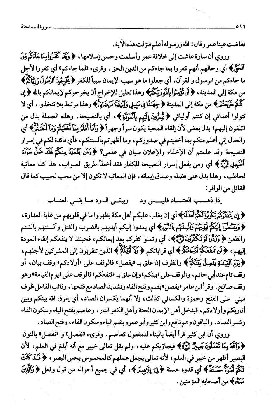 إِنْ يَثْقَفُوكُمْ يَكُونُوا لَكُمْ أَعْداءً أي إن يغلب عليكم أهل مكة يظهروا ما في قلوبهم من غاية العداوة، وَيَبْسُطُوا إِلَيْكُمْ أَيْدِيَهُمْ وَأَلْسِنَتَهُمْ بِالسُّوءِ أي يمدوا إليكم أيديهم بالضرب والقتل وألسنتهم بالشتم والطعن وَوَدُّوا لَوْ تَكْفُرُونَ (2) ، أي وتمنوا كفركم بعد إيمانكم، فحينئذ لا ينفعكم إلقاء المودة إليهم، لَنْ تَنْفَعَكُمْ أَرْحامُكُمْ أي قراباتكم وَلا أَوْلادُكُمْ الذين تتقربون إلى المشركين لأجلهم، يَوْمَ الْقِيامَةِ يَفْصِلُ بَيْنَكُمْ والظرف إن علق ب «يفصل» فالوقف على «أولادكم» وقف بيان، أو وقف تام عند أبي حاتم، والوقف على «بينكم» وإن علق ب «تنفعكم» فالوقف على «يوم القيامة» وهو وقف صالح. وقرأ ابن عامر «يفصل» بضم وفتح الفاء وتشديد الصاد مع فتحها، ونائب الفاعل ظرف مبني على الفتح وحمزة والكسائي كذلك، إلا أنهما يكسران الصاد، أي يفرق الله بينكم وبين أقاربكم وأولادكم، فيدخل أهل الإيمان الجنة وأهل الكفر النار، وعاصم بفتح الياء وسكون الفاء وكسر الصاد. والباقون وهم نافع وابن كثير وأبو عمرو بضم الياء وسكون الفاء، وفتح الصاد.