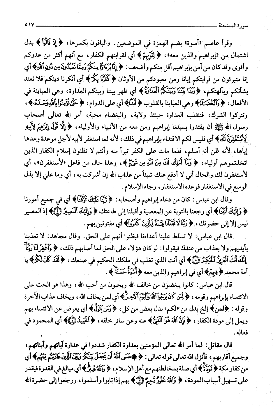 وقرأ عاصم «أسوة» بضم الهمزة في الموضعين. والباقون بكسرها، إِذْ قالُوا بدل اشتمال من «إبراهيم والذين معه» ، لِقَوْمِهِمْ أي لقرابتهم الكفار، مع أنهم أكثر من عدوكم وأقوى وقد كان من آمن بإبراهيم أقل منكم وأضعف: إِنَّا بُرَآؤُا مِنْكُمْ وَمِمَّا تَعْبُدُونَ مِنْ دُونِ اللَّهِ أي إنا متبرئون من قرابتكم إيانا ومن معبودكم من الأوثان كَفَرْنا بِكُمْ أي أنكرنا دينكم فلا نعتد بشأنكم وبآلهتكم، وَبَدا بَيْنَنا وَبَيْنَكُمُ الْعَداوَةُ أي ظهر بيننا وبينكم العداوة، وهي المباينة في الأفعال، وَالْبَغْضاءُ وهي المباينة بالقلوب أَبَداً أي على الدوام، حَتَّى تُؤْمِنُوا بِاللَّهِ وَحْدَهُ، وتتركوا الشرك، فتنقلب العداوة حينئذ ولاية، والبغضاء محبة، أمر الله تعالى أصحاب رسول الله صلّى الله عليه وسلّم أن يقتدوا بسيدنا إبراهيم ومن معه من الأنبياء والأولياء، إِلَّا قَوْلَ إِبْراهِيمَ لِأَبِيهِ لَأَسْتَغْفِرَنَّ لَكَ أي فليس لكم الاقتداء بإبراهيم في ذلك، لأنه لما استغفر لأبيه لأجل موعدة وعدها إياها، لأنه ظن أنه أسلم، فلما مات على الكفر تبرأ منه وأنتم لا تظنون إسلام الكفار الذين اتخذتموهم أولياء، وَما أَمْلِكُ لَكَ مِنَ اللَّهِ مِنْ شَيْءٍ، وهذا حال من فاعل «لأستغفرن» ، أي لأستغفرن لك والحال أني لا أدفع عنك شيئا من عذاب الله إن أشركت به، أي وما علي إلا بذل الوسع في الاستغفار فوعده الاستغفار، رجاء الإسلام.