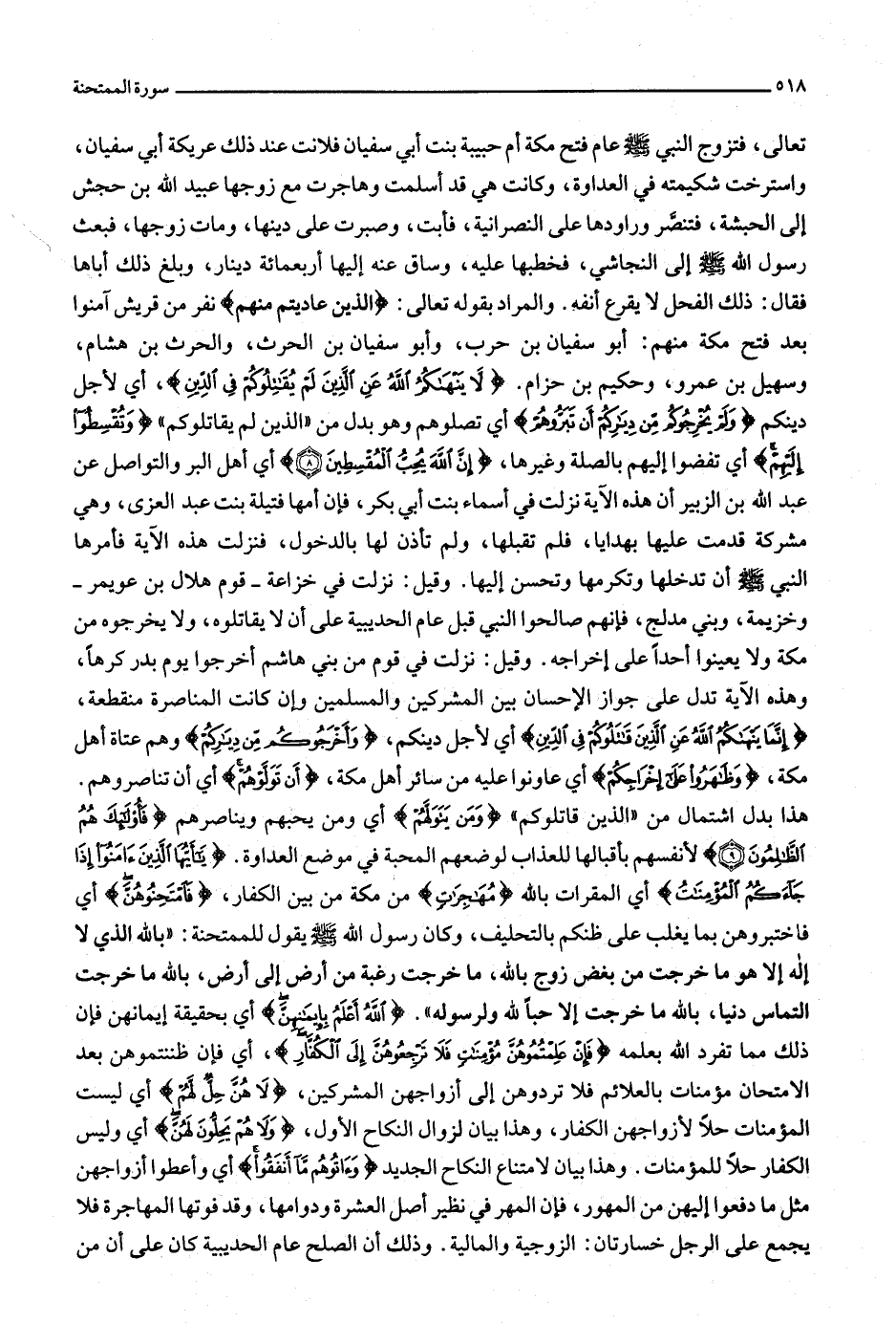 تعالى، فتزوج النبي صلّى الله عليه وسلّم عام فتح مكة أم حبيبة بنت أبي سفيان فلانت عند ذلك عريكة أبي سفيان، واسترخت شكيمته في العداوة، وكانت هي قد أسلمت وهاجرت مع زوجها عبيد الله بن جحش إلى الحبشة، فتنصّر وراودها على النصرانية، فأبت، وصبرت على دينها، ومات زوجها، فبعث رسول الله صلّى الله عليه وسلّم إلى النجاشي، فخطبها عليه، وساق عنه إليها أربعمائة دينار، وبلغ ذلك أباها فقال: ذلك الفحل لا يقرع أنفه. والمراد بقوله تعالى: الَّذِينَ عادَيْتُمْ مِنْهُمْ نفر من قريش آمنوا بعد فتح مكة منهم: أبو سفيان بن حرب، وأبو سفيان بن الحرث، والحرث بن هشام، وسهيل بن عمرو، وحكيم بن حزام. لا يَنْهاكُمُ اللَّهُ عَنِ الَّذِينَ لَمْ