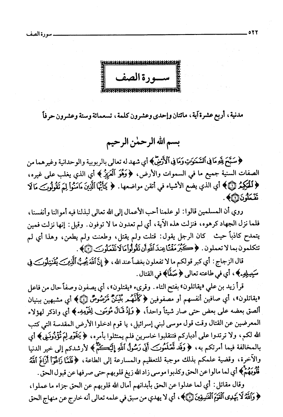 سَبَّحَ لِلَّهِ ما فِي السَّماواتِ وَما فِي الْأَرْضِ أي شهد له تعالى بالربوبية والوحدانية وغيرهما من الصفات السنية جميع ما في السموات والأرض، وَهُوَ الْعَزِيزُ أي الذي يغلب على غيره، الْحَكِيمُ (1) أي الذي يضع الأشياء في أتقن مواضعها. يا أَيُّهَا الَّذِينَ آمَنُوا لِمَ تَقُولُونَ ما لا تَفْعَلُونَ (2) .