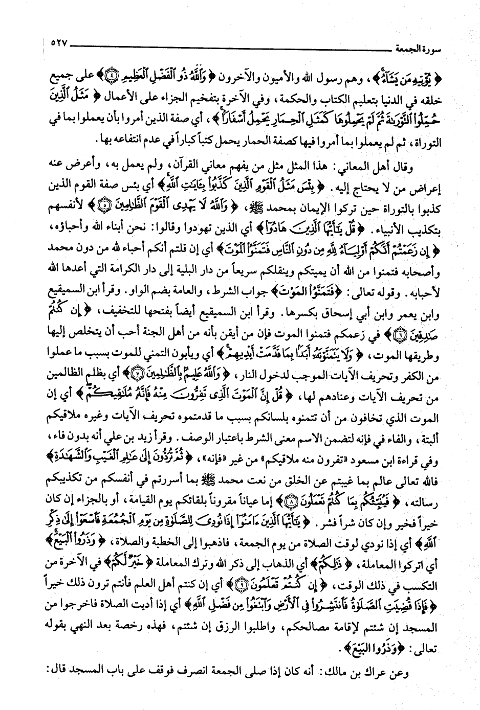 وقال أهل المعاني: هذا المثل مثل من يفهم معاني القرآن، ولم يعمل به، وأعرض عنه إعراض من لا يحتاج إليه. بِئْسَ مَثَلُ الْقَوْمِ الَّذِينَ كَذَّبُوا بِآياتِ اللَّهِ أي بئس صفة القوم الذين كذبوا بالتوراة حين تركوا الإيمان بمحمد صلّى الله عليه وسلّم، وَاللَّهُ لا يَهْدِي الْقَوْمَ الظَّالِمِينَ (5) لأنفسهم بتكذيب الأنبياء. قُلْ يا أَيُّهَا الَّذِينَ هادُوا أي الذين تهودوا وقالوا: نحن أبناء الله وأحباؤه، إِنْ زَعَمْتُمْ أَنَّكُمْ أَوْلِياءُ لِلَّهِ مِنْ دُونِ النَّاسِ فَتَمَنَّوُا الْمَوْتَ أي إن قلتم أنكم أحباء لله من دون محمد وأصحابه فتمنوا من الله أن يميتكم وينقلكم سريعا من دار البلية إلى دار الكرامة التي أعدها الله لأحبابه. وقوله تعالى: فَتَمَنَّوُا الْمَوْتَ جواب الشرط، والعامة بضم الواو. وقرأ ابن السميقع وابن يعمر وابن أبي إسحاق بكسرها. وقرأ ابن السميقع أيضا بفتحها للتخفيف، إِنْ كُنْتُمْ صادِقِينَ (6) في زعمكم فتمنوا الموت فإن من أيقن بأنه من أهل الجنة أحب أن يتخلص إليها وطريقها الموت، وَلا يَتَمَنَّوْنَهُ أَبَداً بِما قَدَّمَتْ أَيْدِيهِمْ أي ويأبون التمني للموت بسبب ما عملوا من الكفر وتحريف الآيات الموجب لدخول النار، وَاللَّهُ عَلِيمٌ بِالظَّالِمِينَ (7) أي بظلم الظالمين من تحريف الآيات وعنادهم لها، قُلْ إِنَّ الْمَوْتَ الَّذِي تَفِرُّونَ مِنْهُ فَإِنَّهُ مُلاقِيكُمْ أي إن الموت الذي تخافون من أن تتمنوه بلسانكم بسبب ما قدمتموه تحريف الآيات وغيره ملاقيكم ألبتة، والفاء في فإنه لتضمن الاسم معنى الشرط باعتبار الوصف. وقرأ زيد بن علي أنه بدون فاء، وفي قراءة ابن مسعود «تفرون منه ملاقيكم» من غير «فإنه» ، ثُمَّ تُرَدُّونَ إِلى عالِمِ الْغَيْبِ وَالشَّهادَةِ فالله تعالى عالم بما غيبتم عن الخلق من نعت محمد صلّى الله عليه وسلّم بما أسررتم في أنفسكم من تكذيبكم رسالته، فَيُنَبِّئُكُمْ بِما كُنْتُمْ تَعْمَلُونَ (8) إما عيانا مقرونا بلقائكم يوم القيامة، أو بالجزاء إن كان خيرا فخير وإن كان شرا فشر. يا أَيُّهَا الَّذِينَ آمَنُوا إِذا نُودِيَ لِلصَّلاةِ مِنْ يَوْمِ الْجُمُعَةِ فَاسْعَوْا إِلى ذِكْرِ اللَّهِ أي إذا نودي لوقت الصلاة من يوم الجمعة، فاذهبوا إلى الخطبة والصلاة، وَذَرُوا الْبَيْعَ أي اتركوا المعاملة، ذلِكُمْ أي الذهاب إلى ذكر الله وترك المعاملة خَيْرٌ لَكُمْ في الآخرة من التكسب في ذلك الوقت، إِنْ كُنْتُمْ تَعْلَمُونَ (9) أي إن كنتم أهل العلم فأنتم ترون ذلك خيرا فَإِذا قُضِيَتِ الصَّلاةُ فَانْتَشِرُوا فِي الْأَرْضِ وَابْتَغُوا مِنْ فَضْلِ اللَّهِ أي إذا أديت الصلاة فاخرجوا من المسجد إن شئتم لإقامة مصالحكم، واطلبوا الرزق إن شئتم، فهذه رخصة بعد النهي بقوله تعالى: وَذَرُوا الْبَيْعَ.