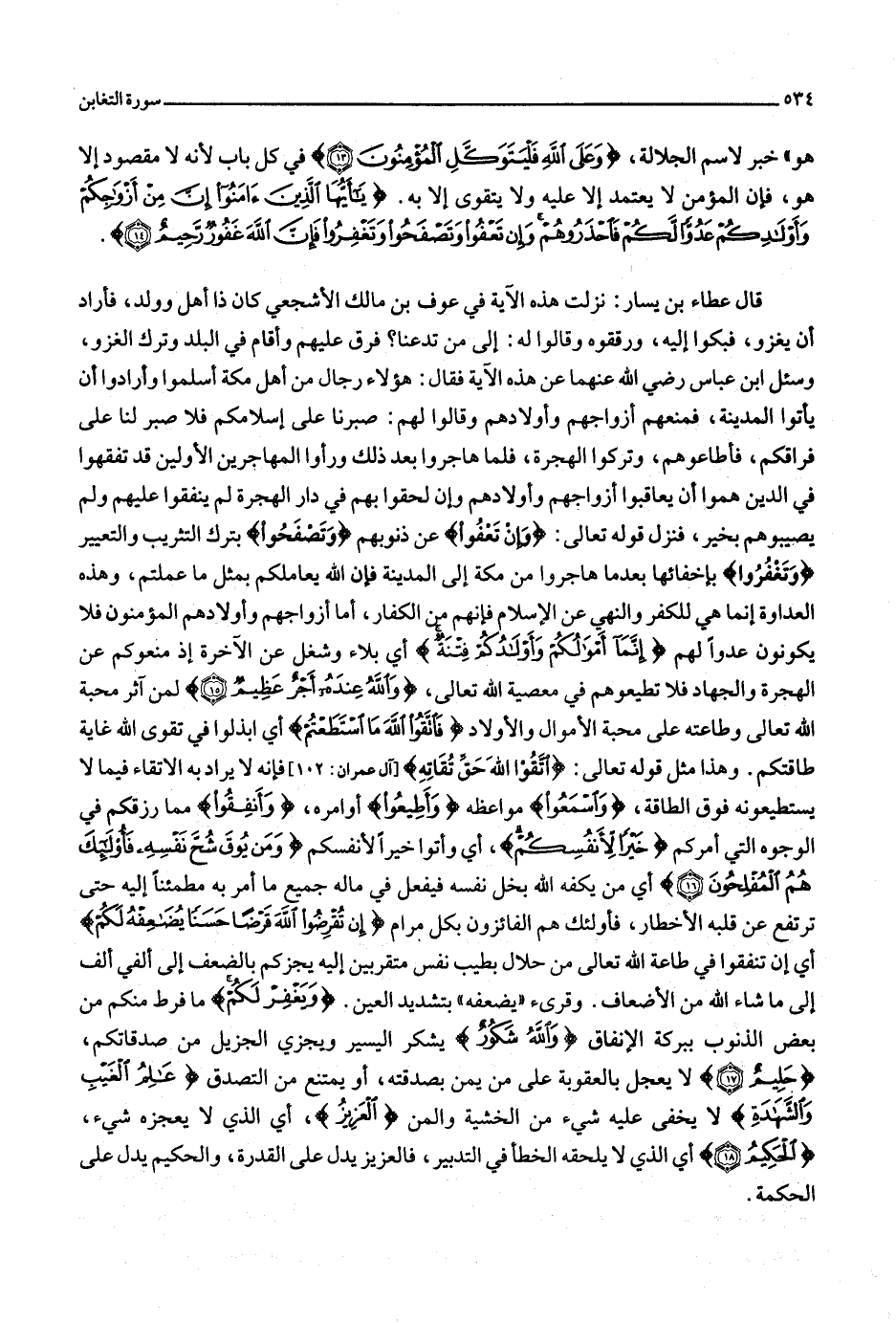 (15) لمن آثر محبة الله تعالى وطاعته على محبة الأموال والأولاد فَاتَّقُوا اللَّهَ مَا اسْتَطَعْتُمْ أي ابذلوا في تقوى الله غاية طاقتكم. وهذا مثل قوله تعالى: اتَّقُوا اللَّهَ حَقَّ تُقاتِهِ [آل عمران: 102] فإنه لا يراد به الاتقاء فيما لا يستطيعونه فوق الطاقة، وَاسْمَعُوا مواعظه وَأَطِيعُوا أوامره، وَأَنْفِقُوا مما رزقكم في الوجوه التي أمركم خَيْراً لِأَنْفُسِكُمْ، أي وأتوا خيرا لأنفسكم وَمَنْ يُوقَ شُحَّ نَفْسِهِ فَأُولئِكَ هُمُ الْمُفْلِحُونَ (16) أي من يكفه الله بخل نفسه فيفعل في ماله جميع ما أمر به مطمئنا إليه حتى ترتفع عن قلبه الأخطار، فأولئك هم الفائزون بكل مرام إِنْ تُقْرِضُوا اللَّهَ قَرْضاً حَسَناً يُضاعِفْهُ لَكُمْ أي إن تنفقوا في طاعة الله تعالى من حلال بطيب نفس متقربين إليه يجزكم بالضعف إلى ألفي ألف إلى ما شاء الله من الأضعاف. وقرئ «يضعفه» بتشديد العين. وَيَغْفِرْ لَكُمْ ما فرط منكم من بعض الذنوب ببركة الإنفاق وَاللَّهُ شَكُورٌ يشكر اليسير ويجزي الجزيل من صدقاتكم، حَلِيمٌ (17) لا يعجل بالعقوبة على من يمن بصدقته، أو يمتنع من التصدق عالِمُ الْغَيْبِ وَالشَّهادَةِ لا يخفى عليه شيء من الخشية والمن الْعَزِيزُ، أي الذي لا يعجزه شيء، الْحَكِيمُ (18) أي الذي لا يلحقه الخطأ في التدبير، فالعزيز يدل على القدرة، والحكيم يدل على الحكمة.
