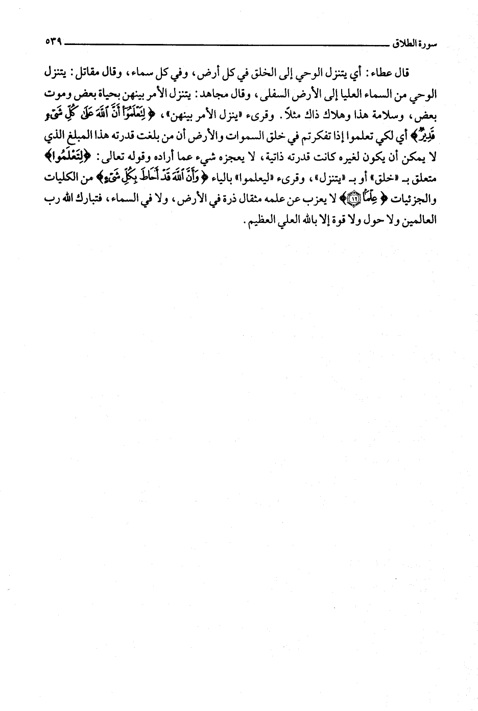 قال عطاء: أي يتنزل الوحي إلى الخلق في كل أرض، وفي كل سماء، وقال مقاتل: يتنزل الوحي من السماء العليا إلى الأرض السفلى، وقال مجاهد: يتنزل الأمر بينهن بحياة بعض وموت بعض، وسلامة هذا وهلاك ذاك مثلا. وقرئ «ينزل الأمر بينهن» ، لِتَعْلَمُوا أَنَّ اللَّهَ عَلى كُلِّ شَيْءٍ قَدِيرٌ أي لكي تعلموا إذا تفكرتم في خلق السموات والأرض أن من بلغت قدرته هذا المبلغ الذي لا يمكن أن يكون لغيره كانت قدرته ذاتية، لا يعجزه شيء عما أراده وقوله تعالى: لِتَعْلَمُوا متعلق ب «خلق» أو ب «يتنزل» ، وقرئ «ليعلموا» بالياء وَأَنَّ اللَّهَ قَدْ أَحاطَ بِكُلِّ شَيْءٍ من الكليات والجزئيات عِلْماً (12) لا يعزب عن علمه مثقال ذرة في الأرض، ولا في السماء، فتبارك الله رب العالمين ولا حول ولا قوة إلا بالله العلي العظيم.