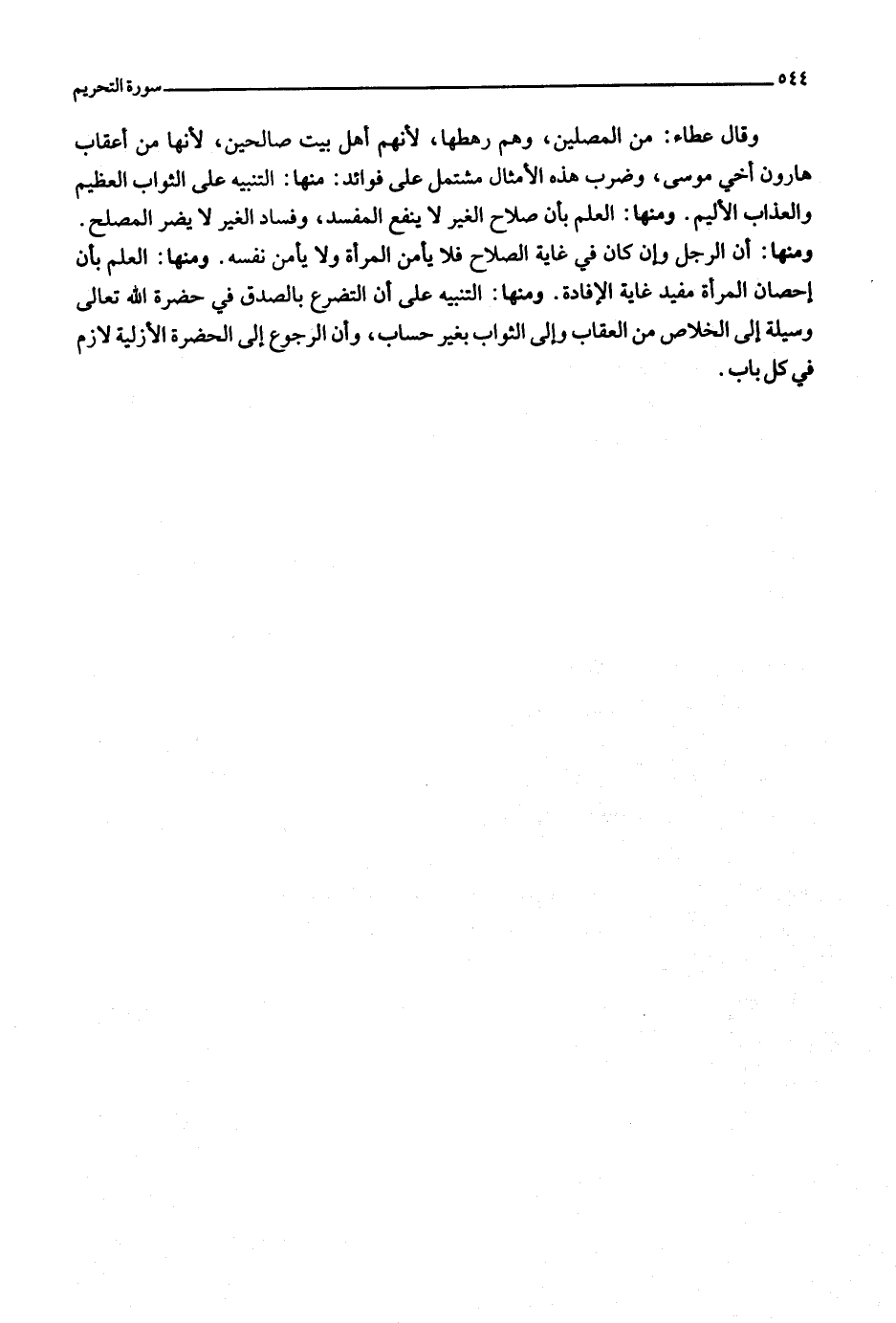 وقال عطاء: من المصلين، وهم رهطها، لأنهم أهل بيت صالحين، لأنها من أعقاب هارون أخي موسى، وضرب هذه الأمثال مشتمل على فوائد: منها: التنبيه على الثواب العظيم والعذاب الأليم. ومنها: العلم بأن صلاح الغير لا ينفع المفسد، وفساد الغير لا يضر المصلح.