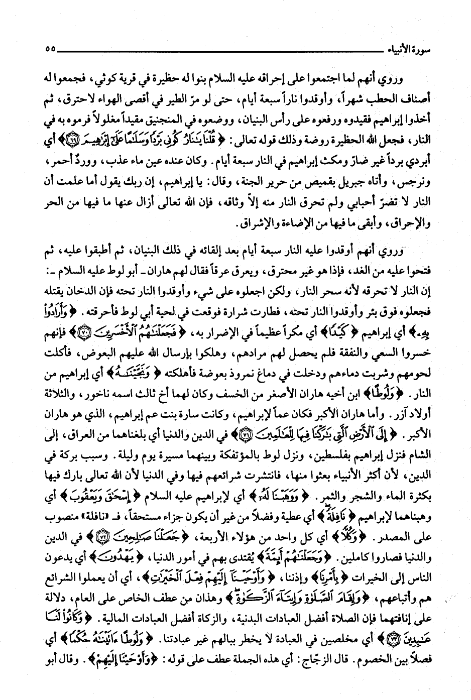 وَنَجَّيْناهُ أي إبراهيم من النار. وَلُوطاً ابن أخيه هاران الأصغر من الخسف وكان لهما أخ ثالث اسمه ناخور، والثلاثة أولاد آزر. وأما هاران الأكبر فكان عما لإبراهيم، وكانت سارة بنت عم إبراهيم، الذي هو هاران الأكبر. إِلَى الْأَرْضِ الَّتِي بارَكْنا فِيها لِلْعالَمِينَ (71) في الدين والدنيا أي بلغناهما من العراق، إلى الشام فنزل إبراهيم بفلسطين، ونزل لوط بالمؤتفكة وبينهما مسيرة يوم وليلة. وسبب بركة في الدين، لأن أكثر الأنبياء بعثوا منها، فانتشرت شرائعهم فيها وفي الدنيا لأن الله تعالى بارك فيها بكثرة الماء والشجر والثمر. وَوَهَبْنا لَهُ أي لإبراهيم عليه السلام إِسْحاقَ وَيَعْقُوبَ أي وهبناهما لإبراهيم نافِلَةً أي عطية وفضلا من غير أن يكون جزاء مستحقا، ف «نافلة» منصوب على المصدر. وَكُلًّا أي كل واحد من هؤلاء الأربعة، جَعَلْنا صالِحِينَ (72) في الدين والدنيا فصاروا كاملين. وَجَعَلْناهُمْ أَئِمَّةً يقتدى بهم في أمور الدنيا، يَهْدُونَ أي يدعون الناس إلى الخيرات بِأَمْرِنا وإذننا، وَأَوْحَيْنا إِلَيْهِمْ فِعْلَ الْخَيْراتِ، أي أن يعملوا الشرائع هم وأتباعهم، وَإِقامَ الصَّلاةِ وَإِيتاءَ الزَّكاةِ وهذان من عطف الخاص على العام، دلالة على إنافتهما فإن الصلاة أفضل العبادات البدنية، والزكاة أفضل العبادات المالية. وَكانُوا لَنا عابِدِينَ (73) أي مخلصين في العبادة لا يخطر ببالهم غير عبادتنا. وَلُوطاً آتَيْناهُ حُكْماً أي فصلا بين الخصوم. قال الزجّاج: أي هذه الجملة عطف على قوله: وَأَوْحَيْنا إِلَيْهِمْ. وقال أبو