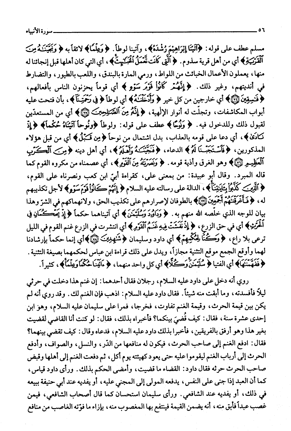 مسلم عطف على قوله: آتَيْنا إِبْراهِيمَ رُشْدَهُ، وآتينا لوطا. وَعِلْماً لائقا به وَنَجَّيْناهُ مِنَ الْقَرْيَةِ أي من أهل قرية سذوم. الَّتِي كانَتْ تَعْمَلُ الْخَبائِثَ، أي التي كان أهلها قبل إنجائنا له منها، يعملون الأعمال الخبائث من اللواط، ورمي المارة بالبندق، واللعب بالطيور، والتضارط في أنديتهم، وغير ذلك. إِنَّهُمْ كانُوا قَوْمَ سَوْءٍ أي قوما يحزنون الناس بأفعالهم، فاسِقِينَ (74) أي خارجين من كل خير وَأَدْخَلْناهُ أي لوطا فِي رَحْمَتِنا، بأن فتحت عليه أبواب المكاشفات، وتجلّت له أنوار الإلهية، إِنَّهُ مِنَ الصَّالِحِينَ (75) أي من المستعدّين لقبول ذلك وللدخول فيه. وَنُوحاً عطف على قوله: ولوطا وَلُوطاً آتَيْناهُ حُكْماً إِذْ نادى، أي دعا على قومه بالعذاب، بدل اشتمال من نوحا مِنْ قَبْلُ أي من قبل هؤلاء المذكورين، فَاسْتَجَبْنا لَهُ الدعاء، فَنَجَّيْناهُ وَأَهْلَهُ، أي أهل دينه مِنَ الْكَرْبِ الْعَظِيمِ (76) وهو الغرق وأذية قومه. وَنَصَرْناهُ مِنَ الْقَوْمِ، أي عصمناه من مكروه القوم كما قاله المبرد. وقال أبو عبيدة: من بمعنى على، كقراءة أبيّ ابن كعب ونصرناه على القوم، الَّذِينَ كَذَّبُوا بِآياتِنا، الدالة على رسالته عليه السلام إِنَّهُمْ كانُوا قَوْمَ سَوْءٍ لأجل تكذيبهم له، فَأَغْرَقْناهُمْ أَجْمَعِينَ (77) بالطوفان لإصرارهم على تكذيب الحق، ولانهماكهم في الشرّ وهذا بيان للوجه الذي خلّصه الله منهم به. وَداوُدَ وَسُلَيْمانَ أي آتيناهما حكما إِذْ يَحْكُمانِ فِي الْحَرْثِ أي في حق الزرع، إِذْ نَفَشَتْ فِيهِ غَنَمُ الْقَوْمِ أي انتشرت في الزرع غنم القوم في الليل ترعى بلا راع، وَكُنَّا لِحُكْمِهِمْ أي داود وسليمان شاهِدِينَ (78) أي إنما حكما بإرشادنا لهما وأوقع الجمع موقع التثنية مجازا، ويدل على ذلك قراءة ابن عباس لحكمهما بصيغة التثنية.