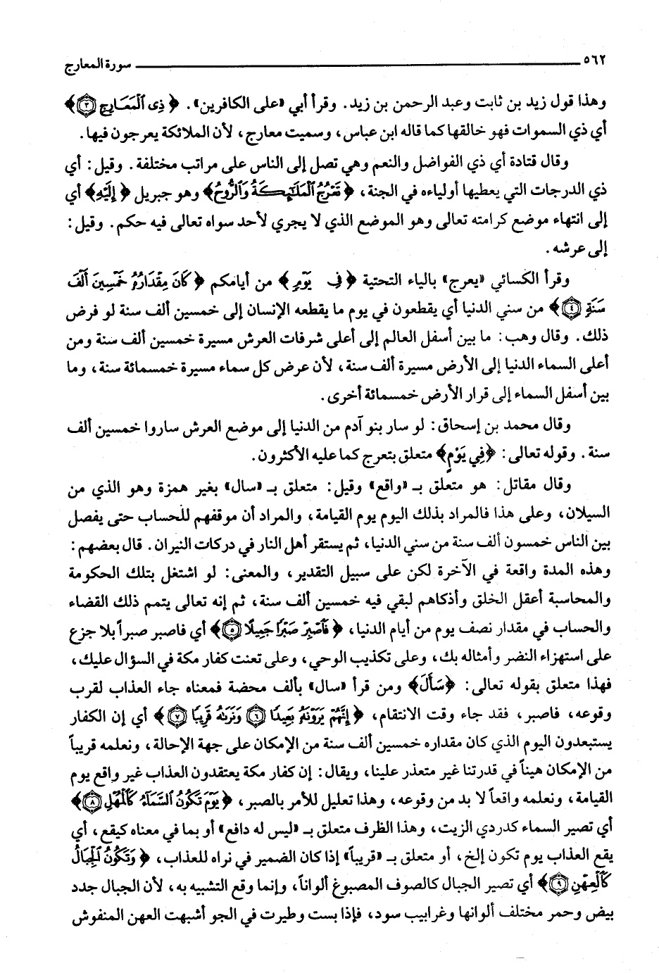 وهذه المدة واقعة في الآخرة لكن على سبيل التقدير، والمعنى: لو اشتغل بتلك الحكومة والمحاسبة أعقل الخلق وأذكاهم لبقي فيه خمسين ألف سنة، ثم إنه تعالى يتمم ذلك القضاء والحساب في مقدار نصف يوم من أيام الدنيا، فَاصْبِرْ صَبْراً جَمِيلًا (5) أي فاصبر صبرا بلا جزع على استهزاء النضر وأمثاله بك، وعلى تكذيب الوحي، وعلى تعنت كفار مكة في السؤال عليك، فهذا متعلق بقوله تعالى: سَأَلَ ومن قرأ «سال» بألف محضة فمعناه جاء العذاب لقرب وقوعه، فاصبر، فقد جاء وقت الانتقام، إِنَّهُمْ يَرَوْنَهُ بَعِيداً (6) وَنَراهُ قَرِيباً (7) أي إن الكفار يستبعدون اليوم الذي كان مقداره خمسين ألف سنة من الإمكان على جهة الإحالة، ونعلمه قريبا من الإمكان هينا في قدرتنا غير متعذر علينا، ويقال: إن كفار مكة يعتقدون العذاب غير واقع يوم القيامة، ونعلمه واقعا لا بد من وقوعه، وهذا تعليل للأمر بالصبر، يَوْمَ تَكُونُ السَّماءُ كَالْمُهْلِ (8) أي تصير السماء كدردي الزيت، وهذا الظرف متعلق ب «ليس له دافع» أو بما في معناه كيقع، أي يقع العذاب يوم تكون إلخ، أو متعلق ب «قريبا» إذا كان الضمير في نراه للعذاب، وَتَكُونُ الْجِبالُ كَالْعِهْنِ (9) أي تصير الجبال كالصوف المصبوغ ألوانا، وإنما وقع التشبيه به، لأن الجبال جدد بيض وحمر مختلف ألوانها وغرابيب سود، فإذا بست وطيرت في الجو أشبهت العهن المنفوش