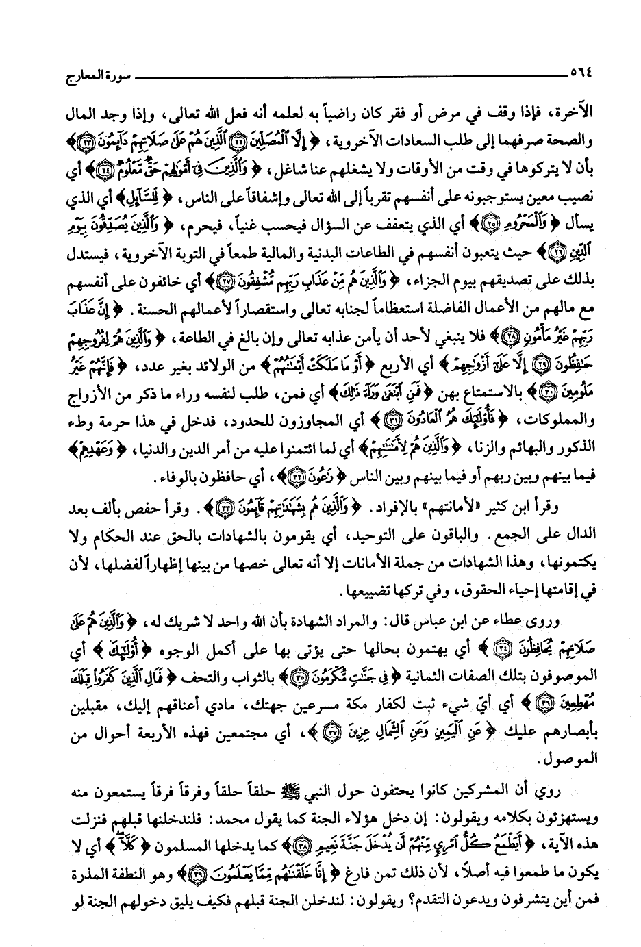 وروى عطاء عن ابن عباس قال: والمراد الشهادة بأن الله واحد لا شريك له، وَالَّذِينَ هُمْ عَلى صَلاتِهِمْ يُحافِظُونَ (34) أي يهتمون بحالها حتى يؤتى بها على أكمل الوجوه أُولئِكَ أي الموصوفون بتلك الصفات الثمانية فِي جَنَّاتٍ مُكْرَمُونَ (35) بالثواب والتحف فَمالِ الَّذِينَ كَفَرُوا قِبَلَكَ مُهْطِعِينَ (36) أي أيّ شيء ثبت لكفار مكة مسرعين جهتك، مادي أعناقهم إليك، مقبلين بأبصارهم عليك عَنِ الْيَمِينِ وَعَنِ الشِّمالِ عِزِينَ (37) ، أي مجتمعين فهذه الأربعة أحوال من الموصول.