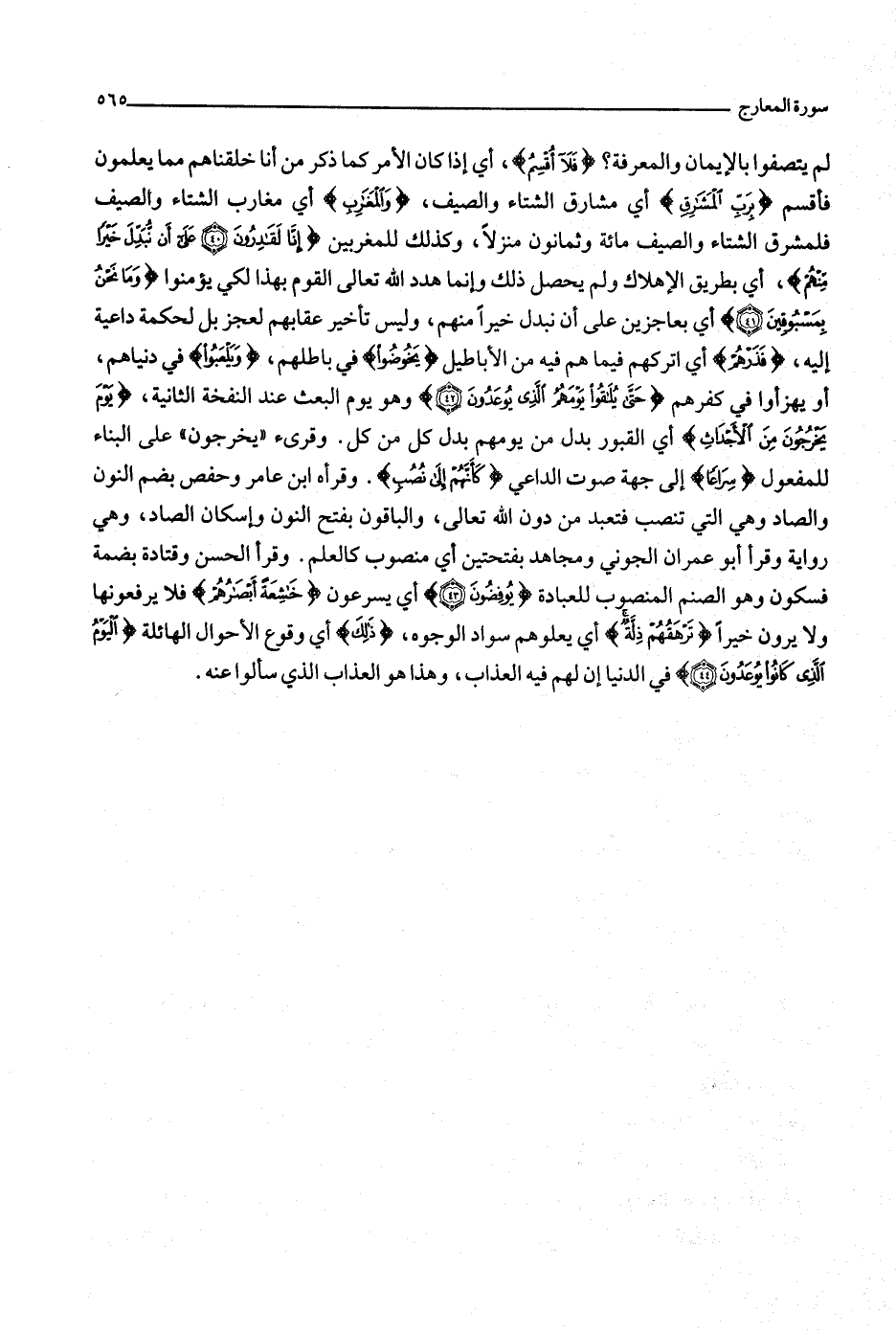إِنَّا لَقادِرُونَ (40) عَلى أَنْ نُبَدِّلَ خَيْراً مِنْهُمْ، أي بطريق الإهلاك ولم يحصل ذلك وإنما هدد الله تعالى القوم بهذا لكي يؤمنوا وَما نَحْنُ بِمَسْبُوقِينَ (41) أي بعاجزين على أن نبدل خيرا منهم، وليس تأخير عقابهم لعجز بل لحكمة داعية إليه، فَذَرْهُمْ أي اتركهم فيما هم فيه من الأباطيل يَخُوضُوا في باطلهم، وَيَلْعَبُوا في دنياهم، أو يهزئوا في كفرهم حَتَّى يُلاقُوا يَوْمَهُمُ الَّذِي يُوعَدُونَ (42) وهو يوم البعث عند النفخة الثانية، يَوْمَ يَخْرُجُونَ مِنَ الْأَجْداثِ أي القبور بدل من يومهم بدل كل من كل. وقرئ «يخرجون» على البناء للمفعول سِراعاً إلى جهة صوت الداعي كَأَنَّهُمْ إِلى نُصُبٍ. وقرأه ابن عامر وحفص بضم النون والصاد وهي التي تنصب فتعبد من دون الله تعالى، والباقون بفتح النون وإسكان الصاد، وهي رواية وقرأ أبو عمران الجوني ومجاهد بفتحتين أي منصوب كالعلم. وقرأ الحسن وقتادة بضمة فسكون وهو الصنم المنصوب للعبادة يُوفِضُونَ (43) أي يسرعون خاشِعَةً أَبْصارُهُمْ فلا يرفعونها ولا يرون خيرا تَرْهَقُهُمْ ذِلَّةٌ أي يعلوهم سواد الوجوه، ذلِكَ أي وقوع الأحوال الهائلة الْيَوْمُ الَّذِي كانُوا يُوعَدُونَ (44) في الدنيا إن لهم فيه العذاب، وهذا هو العذاب الذي سألوا عنه.