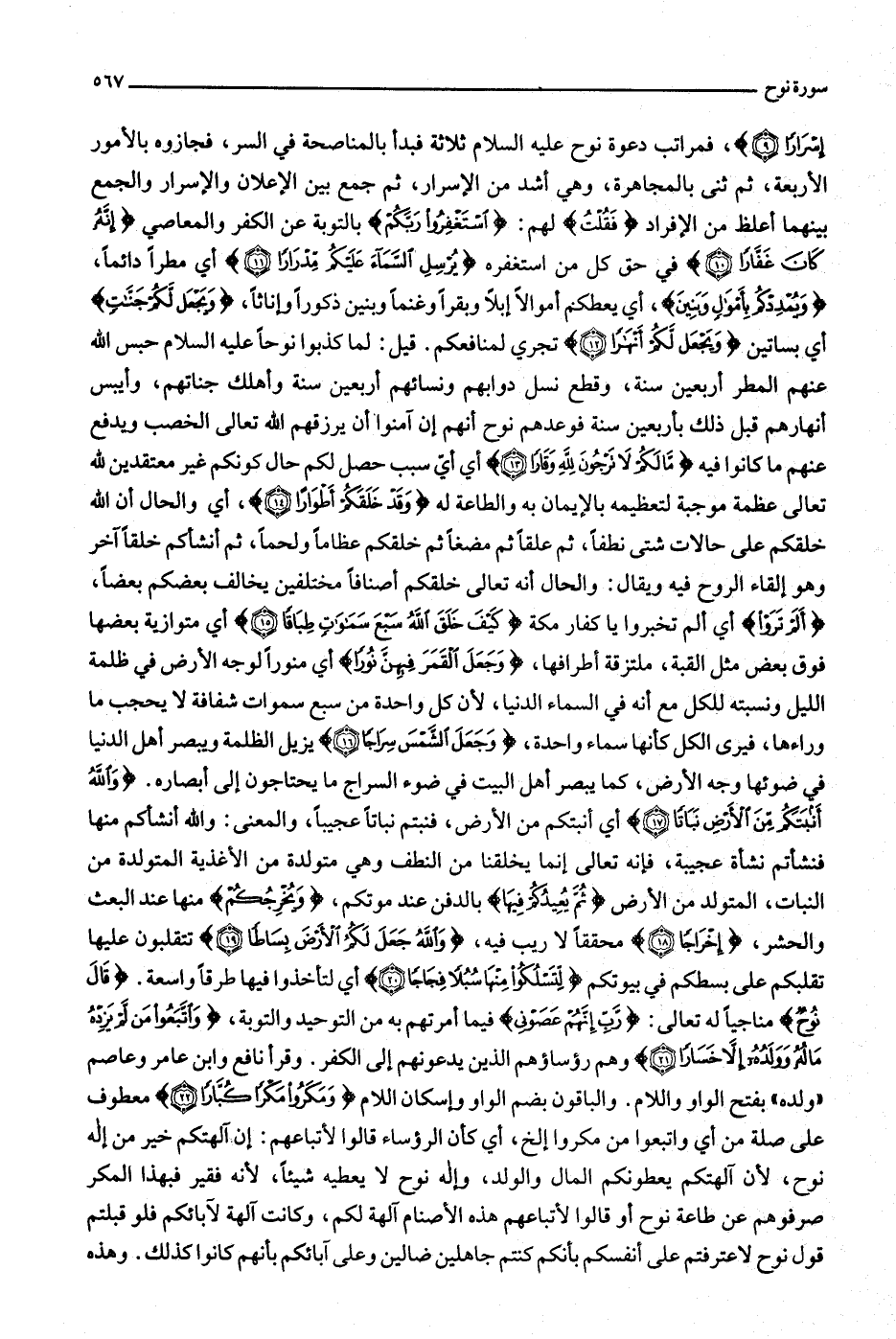 وأيبس أنهارهم قبل ذلك بأربعين سنة فوعدهم نوح أنهم إن آمنوا أن يرزقهم الله تعالى الخصب ويدفع عنهم ما كانوا فيه ما لَكُمْ لا تَرْجُونَ لِلَّهِ وَقاراً (13) أي أيّ سبب حصل لكم حال كونكم غير معتقدين لله تعالى عظمة موجبة لتعظيمه بالإيمان به والطاعة له وَقَدْ خَلَقَكُمْ أَطْواراً (14) ، أي والحال أن الله خلقكم على حالات شتى نطفا، ثم علقا ثم مضغا ثم خلقكم عظاما ولحما، ثم أنشأكم خلقا آخر وهو إلقاء الروح فيه ويقال: والحال أنه تعالى خلقكم أصنافا مختلفين يخالف بعضكم بعضا، أَلَمْ تَرَوْا أي ألم تخبروا يا كفار مكة كَيْفَ خَلَقَ اللَّهُ سَبْعَ سَماواتٍ طِباقاً (15) أي متوازية بعضها فوق بعض مثل القبة، ملتزقة أطرافها، وَجَعَلَ الْقَمَرَ فِيهِنَّ نُوراً أي منورا لوجه الأرض في ظلمة الليل ونسبته للكل مع أنه في السماء الدنيا، لأن كل واحدة من سبع سموات شفافة لا يحجب ما وراءها، فيرى الكل كأنها سماء واحدة، وَجَعَلَ الشَّمْسَ سِراجاً (16) يزيل الظلمة ويبصر أهل الدنيا في ضوئها وجه الأرض، كما يبصر أهل البيت في ضوء السراج ما يحتاجون إلى أبصاره. وَاللَّهُ أَنْبَتَكُمْ مِنَ الْأَرْضِ نَباتاً (17) أي أنبتكم من الأرض، فنبتم نباتا عجيبا، والمعنى: والله أنشأكم منها فنشأتم نشأة عجيبة، فإنه تعالى إنما يخلقنا من النطف وهي متولدة من الأغذية المتولدة من النبات، المتولد من الأرض ثُمَّ يُعِيدُكُمْ فِيها بالدفن عند موتكم، وَيُخْرِجُكُمْ منها عند البعث والحشر، إِخْراجاً (18) محققا لا ريب فيه، وَاللَّهُ جَعَلَ لَكُمُ الْأَرْضَ بِساطاً (19) تتقلبون عليها تقلبكم على بسطكم في بيوتكم لِتَسْلُكُوا مِنْها سُبُلًا فِجاجاً (20) أي لتأخذوا فيها طرقا واسعة.