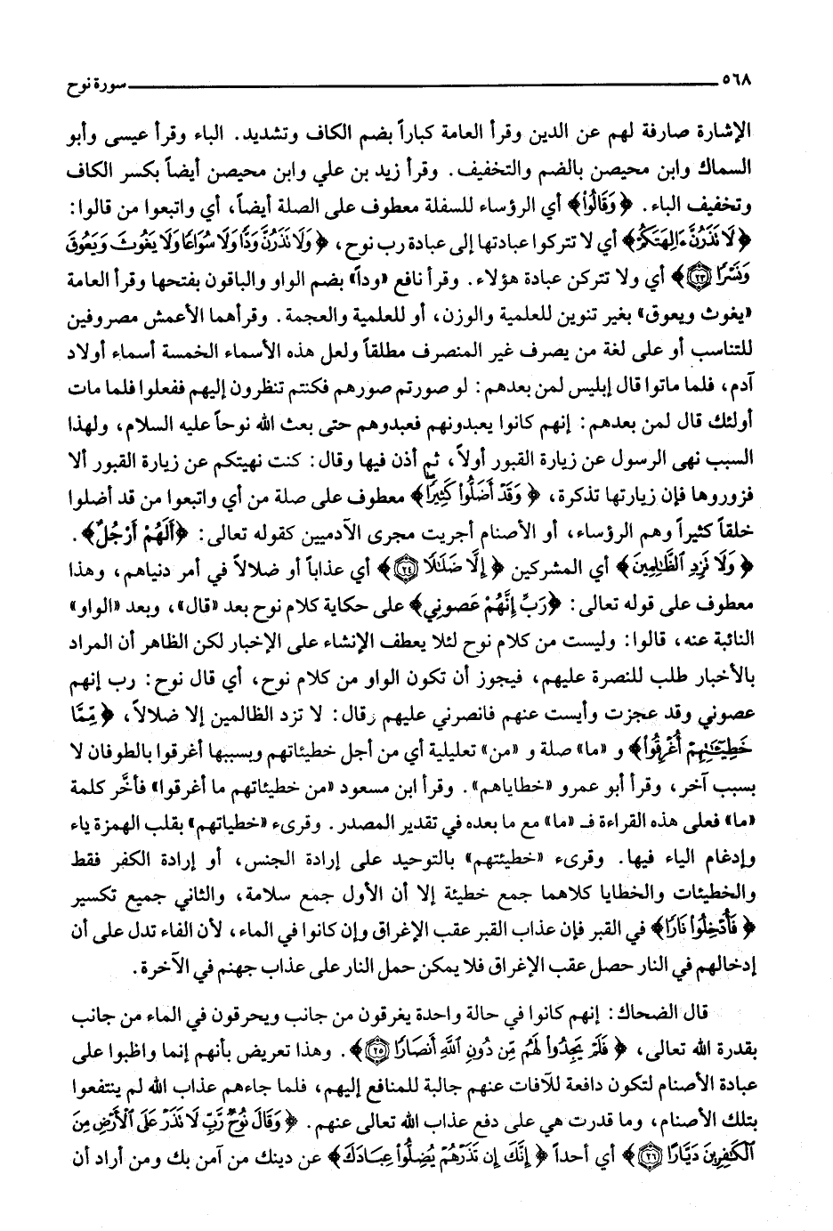 وَلا تَزِدِ الظَّالِمِينَ أي المشركين إِلَّا ضَلالًا (24) أي عذابا أو ضلالا في أمر دنياهم، وهذا معطوف على قوله تعالى: رَبِّ إِنَّهُمْ عَصَوْنِي على حكاية كلام نوح بعد «قال» ، وبعد «الواو» النائبة عنه، قالوا: وليست من كلام نوح لئلا يعطف الإنشاء على الإخبار لكن الظاهر أن المراد بالأخبار طلب للنصرة عليهم، فيجوز أن تكون الواو من كلام نوح، أي قال نوح: رب إنهم عصوني وقد عجزت وأيست عنهم فانصرني عليهم وقال: لا تزد الظالمين إلا ضلالا، مِمَّا خَطِيئاتِهِمْ أُغْرِقُوا و «ما» صلة و «من» تعليلية أي من أجل خطيئاتهم وبسببها أغرقوا بالطوفان لا بسبب آخر، وقرأ أبو عمرو «خطاياهم» . وقرأ ابن مسعود «من خطيئاتهم ما أغرقوا» فأخّر كلمة «ما» فعلى هذه القراءة ف «ما» مع ما بعده في تقدير المصدر. وقرئ «خطياتهم» بقلب الهمزة ياء وإدغام الياء فيها. وقرئ «خطيئتهم» بالتوحيد على إرادة الجنس، أو إرادة الكفر فقط والخطيئات والخطايا كلاهما جمع خطيئة إلا أن الأول جمع سلامة، والثاني جميع تكسير فَأُدْخِلُوا ناراً في القبر فإن عذاب القبر عقب الإغراق وإن كانوا في الماء، لأن الفاء تدل على أن إدخالهم في النار حصل عقب الإغراق فلا يمكن حمل النار على عذاب جهنم في الآخرة.