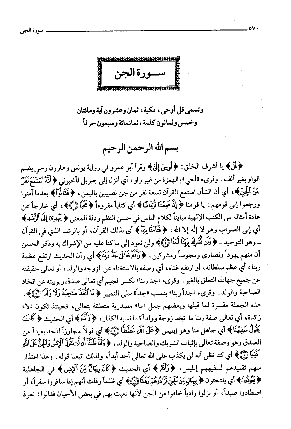 وتسمى قل أوحى، مكية، ثمان وعشرون آية ومائتان وخمس وثمانون كلمة، ثمانمائة وسبعون حرفا