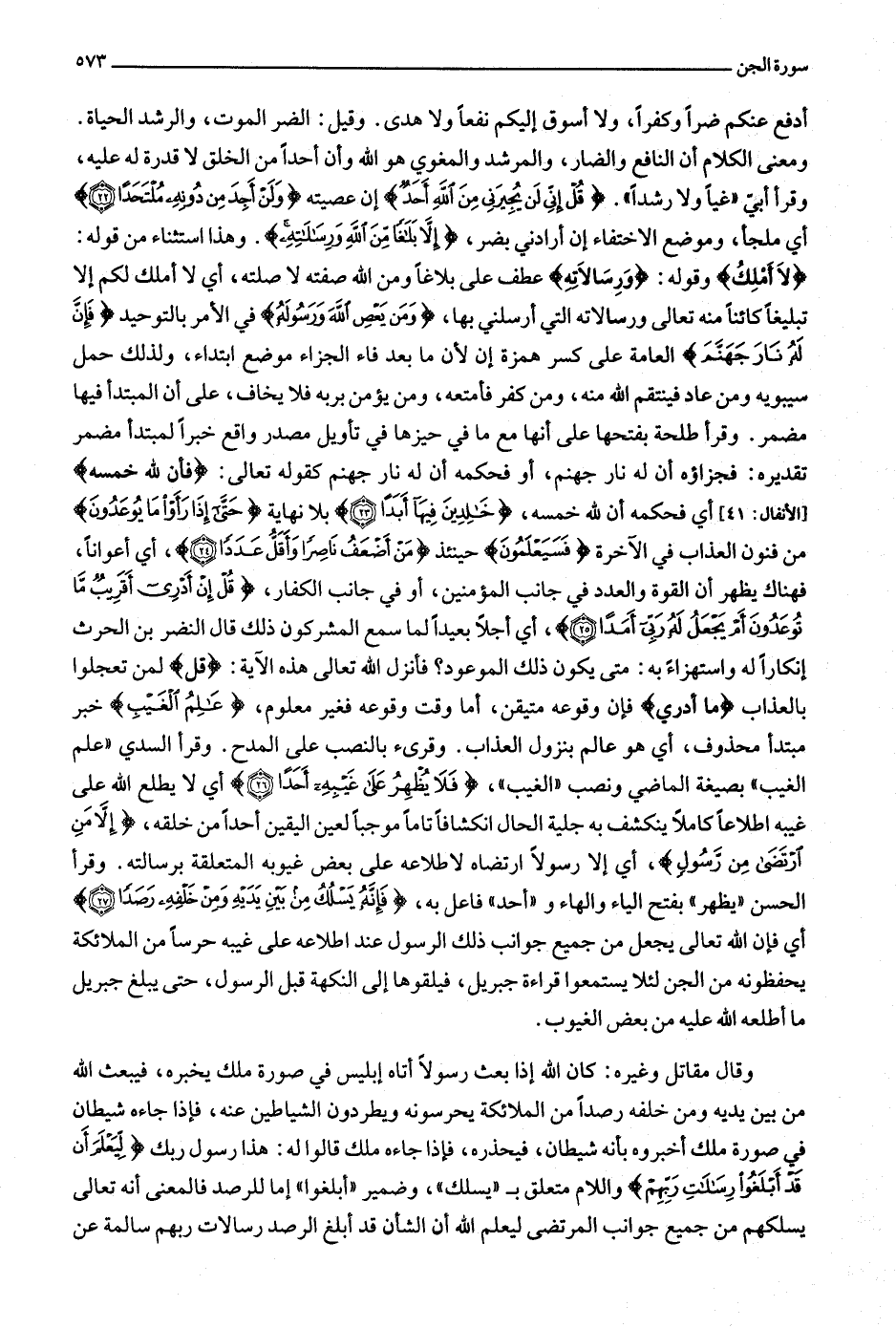 لا أَمْلِكُ وقوله: وَرِسالاتِهِ عطف على بلاغا ومن الله صفته لا صلته، أي لا أملك لكم إلا تبليغا كائنا منه تعالى ورسالاته التي أرسلني بها، وَمَنْ يَعْصِ اللَّهَ وَرَسُولَهُ في الأمر بالتوحيد فَإِنَّ لَهُ نارَ جَهَنَّمَ العامة على كسر همزة إن لأن ما بعد فاء الجزاء موضع ابتداء، ولذلك حمل سيبويه ومن عاد فينتقم الله منه، ومن كفر فأمتعه، ومن يؤمن بربه فلا يخاف، على أن المبتدأ فيها مضمر. وقرأ طلحة بفتحها على أنها مع ما في حيزها في تأويل مصدر واقع خبرا لمبتدأ مضمر تقديره: فجزاؤه أن له نار جهنم، أو فحكمه أن له نار جهنم كقوله تعالى: فَأَنَّ لِلَّهِ خُمُسَهُ [الأنفال: 41] أي فحكمه أن لله خمسه، خالِدِينَ فِيها أَبَداً (23) بلا نهاية حَتَّى إِذا رَأَوْا ما يُوعَدُونَ من فنون العذاب في الآخرة فَسَيَعْلَمُونَ حينئذ مَنْ أَضْعَفُ ناصِراً وَأَقَلُّ عَدَداً (24) ، أي أعوانا، فهناك يظهر أن القوة والعدد في جانب المؤمنين، أو في جانب الكفار، قُلْ إِنْ أَدْرِي أَقَرِيبٌ ما تُوعَدُونَ أَمْ يَجْعَلُ لَهُ رَبِّي أَمَداً (25) ، أي أجلا بعيدا لما سمع المشركون ذلك قال النضر بن الحرث إنكارا له واستهزاء به: متى يكون ذلك الموعود؟ فأنزل الله تعالى هذه الآية: قُلْ لمن تعجلوا بالعذاب إِنْ أَدْرِي فإن وقوعه متيقن، أما وقت وقوعه فغير معلوم، عالِمُ الْغَيْبِ خبر مبتدأ محذوف، أي هو عالم بنزول العذاب. وقرئ بالنصب على المدح. وقرأ السدي «علم الغيب» بصيغة الماضي ونصب «الغيب» ، فَلا يُظْهِرُ عَلى غَيْبِهِ أَحَداً (26) أي لا يطلع الله على غيبه اطلاعا كاملا ينكشف به جلية الحال انكشافا تاما موجبا لعين اليقين أحدا من خلقه، إِلَّا مَنِ ارْتَضى مِنْ رَسُولٍ، أي إلا رسولا ارتضاه لاطلاعه على بعض غيوبه المتعلقة برسالته. وقرأ الحسن «يظهر» بفتح الياء والهاء و «أحد» فاعل به، فَإِنَّهُ يَسْلُكُ مِنْ بَيْنِ يَدَيْهِ وَمِنْ خَلْفِهِ رَصَداً (27) أي فإن الله تعالى يجعل من جميع جوانب ذلك الرسول عند اطلاعه على غيبه حرسا من الملائكة يحفظونه من الجن لئلا يستمعوا قراءة جبريل، فيلقوها إلى النكهة قبل الرسول، حتى يبلغ جبريل ما أطلعه الله عليه من بعض الغيوب.