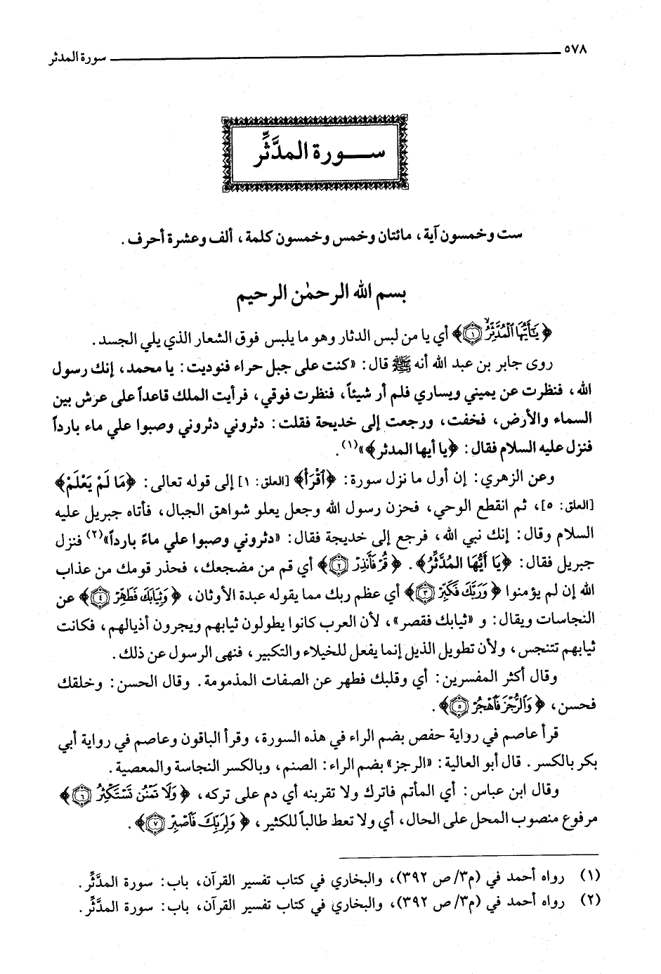 (2) رواه أحمد في (م 3/ ص 392) ، والبخاري في كتاب تفسير القرآن، باب: سورة المدّثّر.