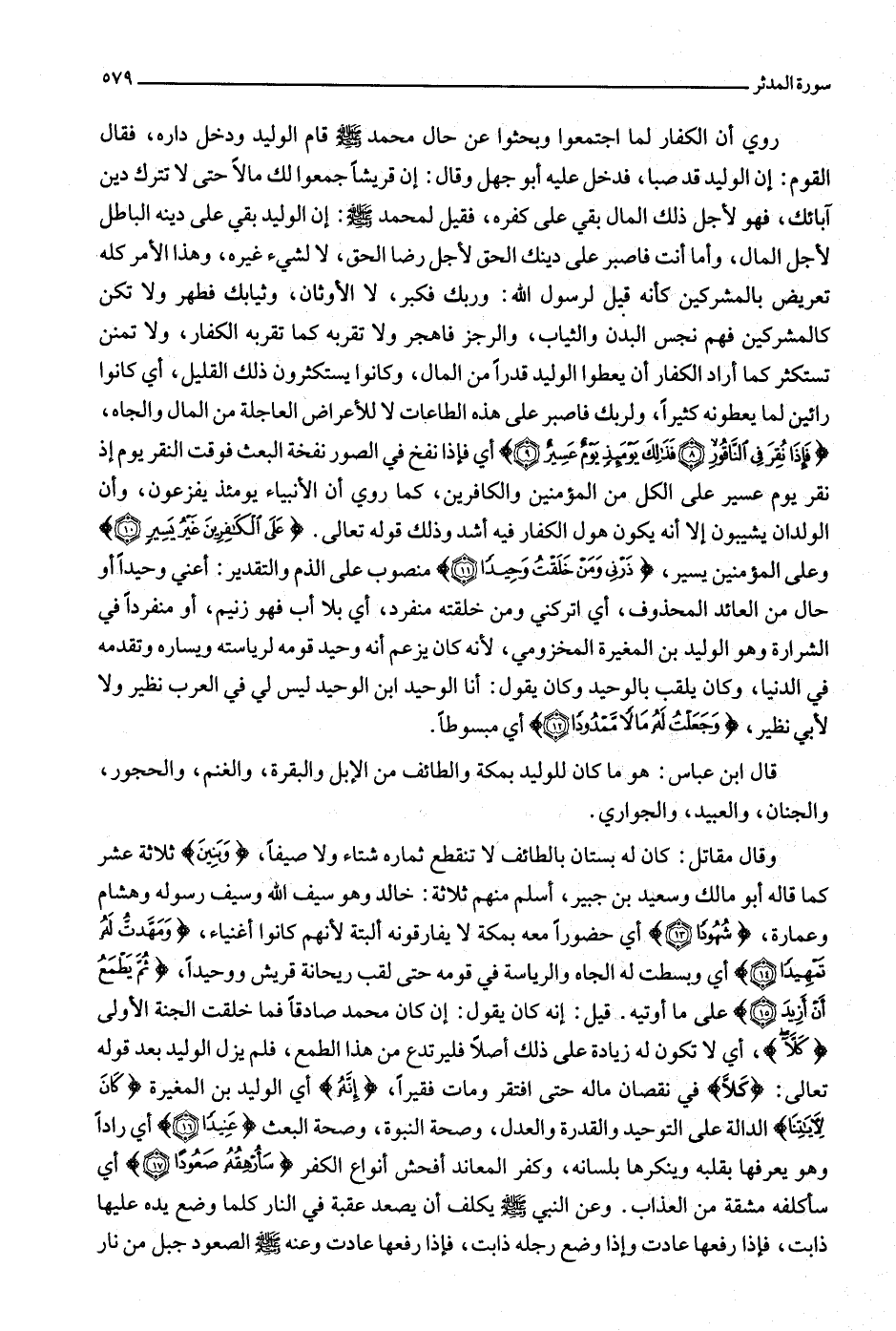 وقال مقاتل: كان له بستان بالطائف لا تنقطع ثماره شتاء ولا صيفا، وَبَنِينَ ثلاثة عشر كما قاله أبو مالك وسعيد بن جبير، أسلم منهم ثلاثة: خالد وهو سيف الله وسيف رسوله وهشام وعمارة، شُهُوداً (13) أي حضورا معه بمكة لا يفارقونه ألبتة لأنهم كانوا أغنياء، وَمَهَّدْتُ لَهُ تَمْهِيداً (14) أي وبسطت له الجاه والرياسة في قومه حتى لقب ريحانة قريش ووحيدا، ثُمَّ يَطْمَعُ أَنْ أَزِيدَ (15) على ما أوتيه. قيل: إنه كان يقول: إن كان محمد صادقا فما خلقت الجنة الأولى كَلَّا، أي لا تكون له زيادة على ذلك أصلا فليرتدع من هذا الطمع، فلم يزل الوليد بعد قوله تعالى: كَلَّا في نقصان ماله حتى افتقر ومات فقيرا، إِنَّهُ أي الوليد بن المغيرة كانَ لِآياتِنا الدالة على التوحيد والقدرة والعدل، وصحة النبوة، وصحة البعث عَنِيداً (16) أي رادا وهو يعرفها بقلبه وينكرها بلسانه، وكفر المعاند أفحش أنواع الكفر سَأُرْهِقُهُ صَعُوداً (17) أي سأكلفه مشقة من العذاب. وعن النبي صلّى الله عليه وسلّم يكلف أن يصعد عقبة في النار كلما وضع يده عليها ذابت، فإذا رفعها عادت وإذا وضع رجله ذابت، فإذا رفعها عادت وعنه صلّى الله عليه وسلّم الصعود جبل من نار