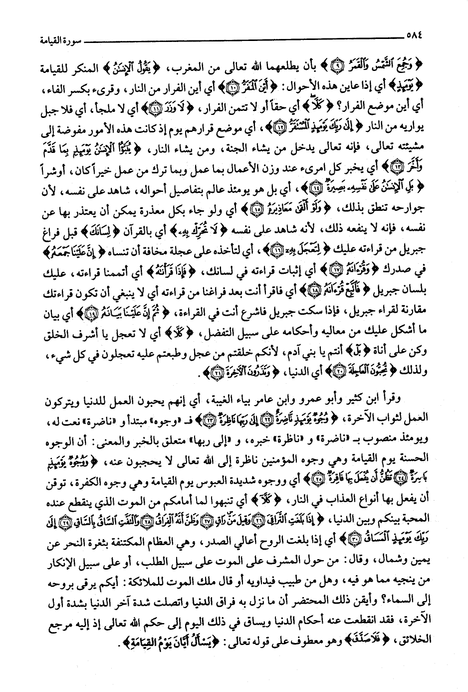 وقرأ ابن كثير وأبو عمرو وابن عامر بياء الغيبة، أي إنهم يحبون العمل للدنيا ويتركون العمل لثواب الآخرة، وُجُوهٌ يَوْمَئِذٍ ناضِرَةٌ (22) إِلى رَبِّها ناظِرَةٌ (23) ف «وجوه» مبتدأ و «ناضرة» نعت له، ويومئذ منصوب ب «ناضرة» و «ناظرة» خبره، و «إلى ربها» متعلق بالخبر والمعنى: أن الوجوه الحسنة يوم القيامة وهي وجوه المؤمنين ناظرة إلى الله تعالى لا يحجبون عنه، وَوُجُوهٌ يَوْمَئِذٍ باسِرَةٌ (24) تَظُنُّ أَنْ يُفْعَلَ بِها فاقِرَةٌ (25) أي ووجوه شديدة العبوس يوم القيامة وهي وجوه الكفرة، توقن أن يفعل بها أنواع العذاب في النار، كَلَّا أي تنبهوا لما أمامكم من الموت الذي ينقطع عنده المحبة بينكم وبين الدنيا، إِذا بَلَغَتِ التَّراقِيَ (26) وَقِيلَ مَنْ راقٍ (27) وَظَنَّ أَنَّهُ الْفِراقُ (28) وَالْتَفَّتِ السَّاقُ بِالسَّاقِ (29) إِلى رَبِّكَ يَوْمَئِذٍ الْمَساقُ (30) أي إذا بلغت الروح أعالي الصدر، وهي العظام المكتنفة بثغرة النحر عن يمين وشمال، وقال: من حول المشرف على الموت على سبيل الطلب، أو على سبيل الإنكار من ينجيه مما هو فيه، وهل من طبيب فيداويه أو قال ملك الموت للملائكة: أيكم يرقى بروحه إلى السماء؟ وأيقن ذلك المحتضر أن ما نزل به فراق الدنيا واتصلت شدة آخر الدنيا بشدة أول الآخرة، فقد انقطعت عنه أحكام الدنيا ويساق في ذلك اليوم إلى حكم الله تعالى إذ إليه مرجع الخلائق،