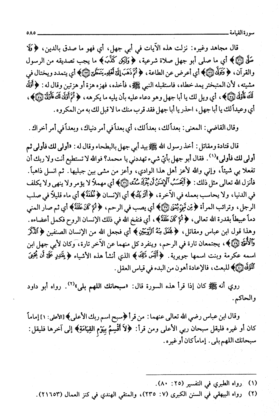 قال مجاهد وغيره: نزلت هذه الآيات في أبي جهل، أي فهو ما صدق بالدين، وَلا صَلَّى (31) أي ما صلى أبو جهل صلاة شرعية، وَلكِنْ كَذَّبَ ما يجب تصديقه من الرسول والقرآن، وَتَوَلَّى (32) أي أعرض عن الطاعة، ثُمَّ ذَهَبَ إِلى أَهْلِهِ يَتَمَطَّى (33) أي يتمدد ويختال في مشيته، لأن المتبختر يمد خطاه، فاستقبله النبي صلّى الله عليه وسلّم، فأخذه، فهزه هزة أو هزتين وقال له: أَوْلى لَكَ فَأَوْلى (34) ، أي ويل لك يا أبا جهل وهو دعاء عليه بأن يليه ما يكرهه، ثُمَّ أَوْلى لَكَ فَأَوْلى (35) ، أي وعيدا لك يا أبا جهل، احذر يا أبا جهل فقد قرب منك ما لا قبل لك به من المكروه.