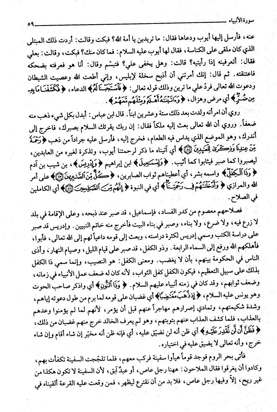 فصلاحهم معصوم من كدر الفساد، فإسماعيل، قد صبر عند ذبحه، وعلى الإقامة في بلد لا زرع فيه، ولا ضرع، ولا بناء، وصبر في بناء البيت فأخرج منه خاتم النبيين. وإدريس قد صبر على دراسة الكتب وسمي إدريس لكثرة دراسته، وبعث إلى قومه داعيا لهم إلى الله تعالى، فأبوا، فأهلكهم الله ورفع إلى السماء الرابعة. وذو الكفل، قد صبر على قيام الليل، وصيام النهار، وأذى الناس في الحكومة بينهم، بأن لا يغضب. ومعنى الكفل: هو النصيب، وإنما سمي ذا الكفل بذلك على سبيل التعظيم، فيكون الكفل كفل الثواب، لأنه كان له ضعف عمل الأنبياء في زمانه، وضعف ثوابهم، وقد كان في زمنه أنبياء عليهم السلام. وَذَا النُّونِ أي واذكر صاحب الحوت وهو يونس عليه السلام، إِذْ ذَهَبَ مُغاضِباً أي غضبان على قومه لما برم من طول دعوته إياهم، وشدة شكيمتهم، وتمادي إصرارهم مهاجرا عنهم قبل أن يؤمر، لأنهم لما لم يؤمنوا