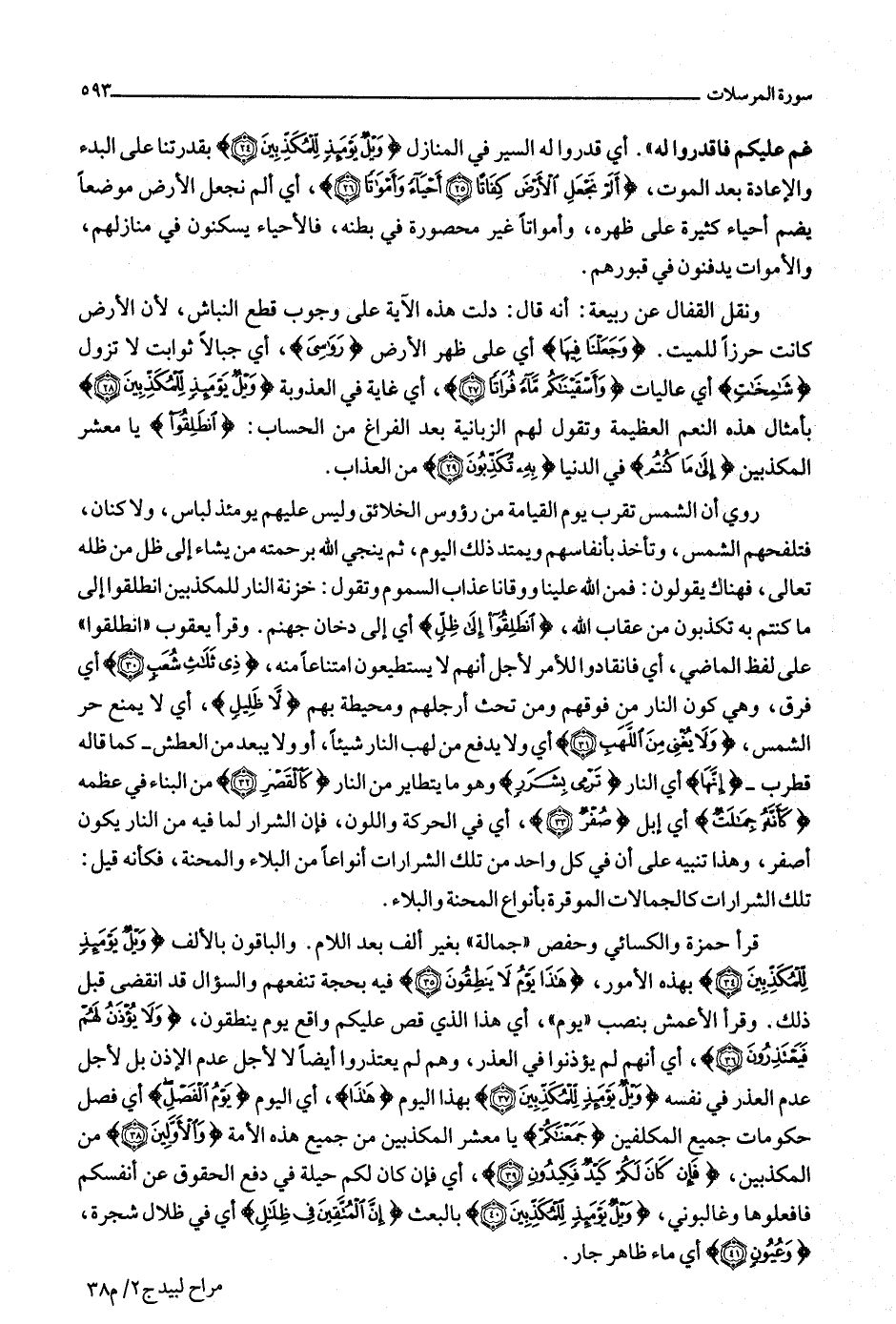 قرأ حمزة والكسائي وحفص «جمالة» بغير ألف بعد اللام. والباقون بالألف وَيْلٌ يَوْمَئِذٍ لِلْمُكَذِّبِينَ (34) بهذه الأمور، هذا يَوْمُ لا يَنْطِقُونَ (35) فيه بحجة تنفعهم والسؤال قد انقضى قبل ذلك. وقرأ الأعمش بنصب «يوم» ، أي هذا الذي قص عليكم واقع يوم ينطقون، وَلا يُؤْذَنُ لَهُمْ فَيَعْتَذِرُونَ (36) ، أي أنهم لم يؤذنوا في العذر، وهم لم يعتذروا أيضا لا لأجل عدم الإذن بل لأجل عدم العذر في نفسه وَيْلٌ يَوْمَئِذٍ لِلْمُكَذِّبِينَ (37) بهذا اليوم هذا، أي اليوم يَوْمُ الْفَصْلِ أي فصل حكومات جميع المكلفين جَمَعْناكُمْ يا معشر المكذبين من جميع هذه الأمة وَالْأَوَّلِينَ (38) من المكذبين، فَإِنْ كانَ لَكُمْ كَيْدٌ فَكِيدُونِ (39) ، أي فإن كان لكم حيلة في دفع الحقوق عن أنفسكم فافعلوها وغالبوني، وَيْلٌ يَوْمَئِذٍ لِلْمُكَذِّبِينَ (40) بالبعث