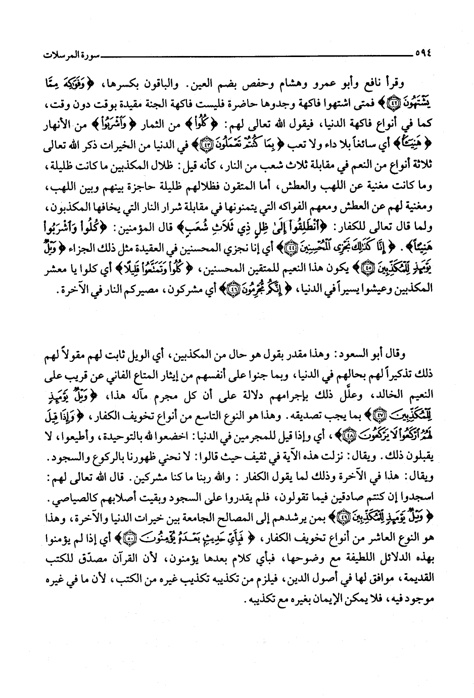 وقرأ نافع وأبو عمرو وهشام وحفص بضم العين. والباقون بكسرها، وَفَواكِهَ مِمَّا يَشْتَهُونَ (42) فمتى اشتهوا فاكهة وجدوها حاضرة فليست فاكهة الجنة مقيدة بوقت دون وقت، كما في أنواع فاكهة الدنيا، فيقول الله تعالى لهم: كُلُوا من الثمار وَاشْرَبُوا من الأنهار هَنِيئاً أي سائغا بلا داء ولا تعب بِما كُنْتُمْ تَعْمَلُونَ (43) في الدنيا من الخيرات ذكر الله تعالى ثلاثة أنواع من النعم في مقابلة ثلاث شعب من النار، كأنه قيل: ظلال المكذبين ما كانت ظليلة، وما كانت مغنية عن اللهب والعطش، أما المتقون فظلالهم ظليلة حاجزة بينهم وبين اللهب، ومغنية لهم عن العطش ومعهم الفواكه التي يتمنونها في مقابلة شرار النار التي يخافها المكذبون، ولما قال تعالى للكفار: انْطَلِقُوا إِلى ظِلٍّ ذِي ثَلاثِ شُعَبٍ قال المؤمنين: كُلُوا وَاشْرَبُوا هَنِيئاً. إِنَّا كَذلِكَ نَجْزِي الْمُحْسِنِينَ (44) أي إنا نجزي المحسنين في العقيدة مثل ذلك الجزاء وَيْلٌ يَوْمَئِذٍ لِلْمُكَذِّبِينَ (45) يكون هذا النعيم للمتقين المحسنين، كُلُوا وَتَمَتَّعُوا قَلِيلًا أي كلوا يا معشر المكذبين وعيشوا يسيرا في الدنيا، إِنَّكُمْ مُجْرِمُونَ (46) أي مشركون، مصيركم النار في الآخرة.