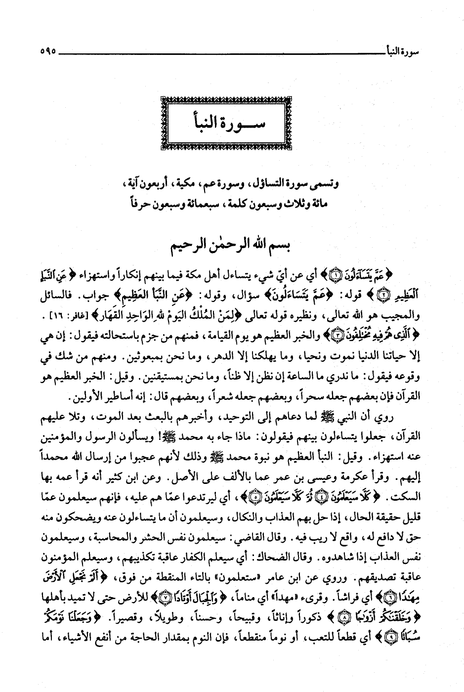 وتسمى سورة التساؤل، وسورة عم، مكية، أربعون آية، مائة وثلاث وسبعون كلمة، سبعمائة وسبعون حرفا