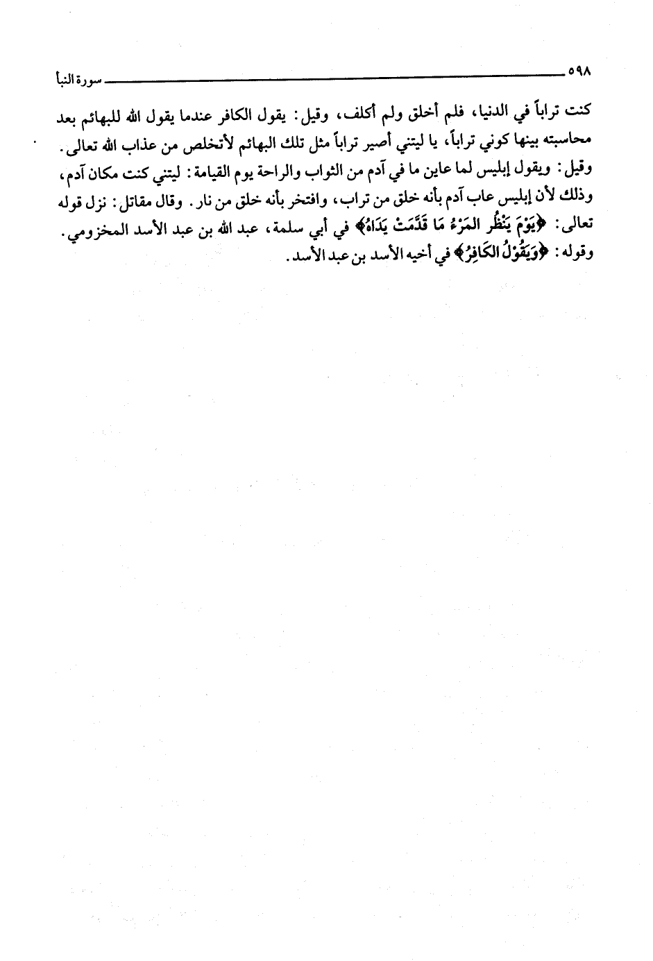 وقيل: ويقول إبليس لما عاين ما في آدم من الثواب والراحة يوم القيامة: ليتني كنت مكان آدم، وذلك لأن إبليس عاب آدم بأنه خلق من تراب، وافتخر بأنه خلق من نار. وقال مقاتل: نزل قوله تعالى: وْمَ يَنْظُرُ الْمَرْءُ ما قَدَّمَتْ يَداهُ