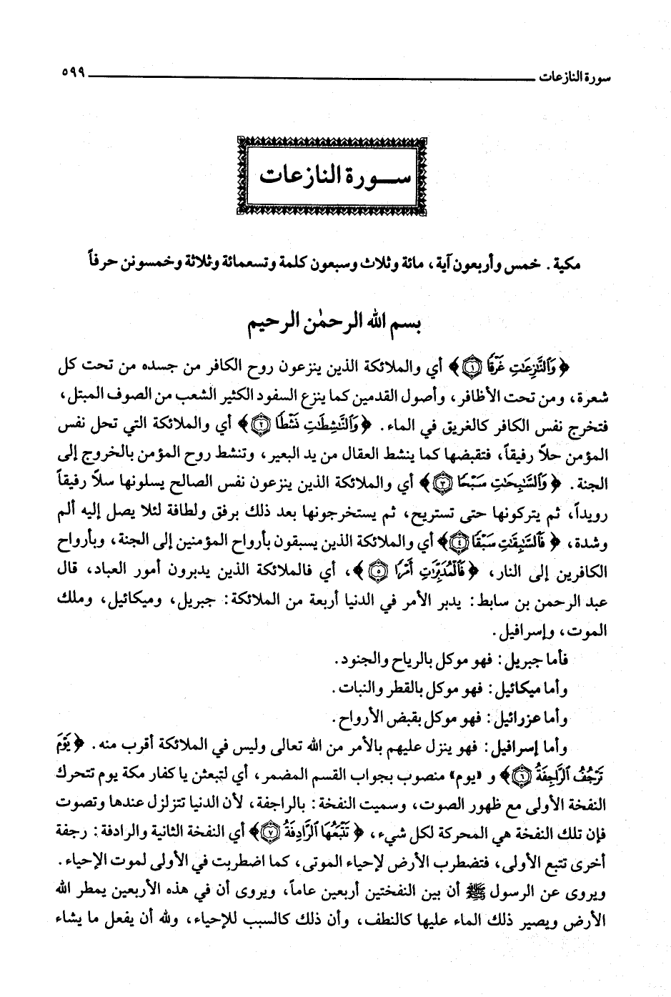 وَالنَّازِعاتِ غَرْقاً (1) أي والملائكة الذين ينزعون روح الكافر من جسده من تحت كل شعرة، ومن تحت الأظافر، وأصول القدمين كما ينزع السفود الكثير الشعب من الصوف المبتل، فتخرج نفس الكافر كالغريق في الماء. وَالنَّاشِطاتِ نَشْطاً (2) أي والملائكة التي تحل نفس المؤمن حلا رفيقا، فتقبضها كما ينشط العقال من يد البعير، وتنشط روح المؤمن بالخروج إلى الجنة. وَالسَّابِحاتِ سَبْحاً (3) أي والملائكة الذين ينزعون نفس الصالح يسلونها سلا رفيقا رويدا، ثم يتركونها حتى تستريح، ثم يستخرجونها بعد ذلك برفق ولطافة لئلا يصل إليه ألم وشدة، فَالسَّابِقاتِ سَبْقاً (4) أي والملائكة الذين يسبقون بأرواح المؤمنين إلى الجنة، وبأرواح الكافرين إلى النار، فَالْمُدَبِّراتِ أَمْراً (5) ، أي فالملائكة الذين يدبرون أمور العباد، قال عبد الرحمن بن سابط: يدبر الأمر في الدنيا أربعة من الملائكة: جبريل، وميكائيل، وملك الموت، وإسرافيل.