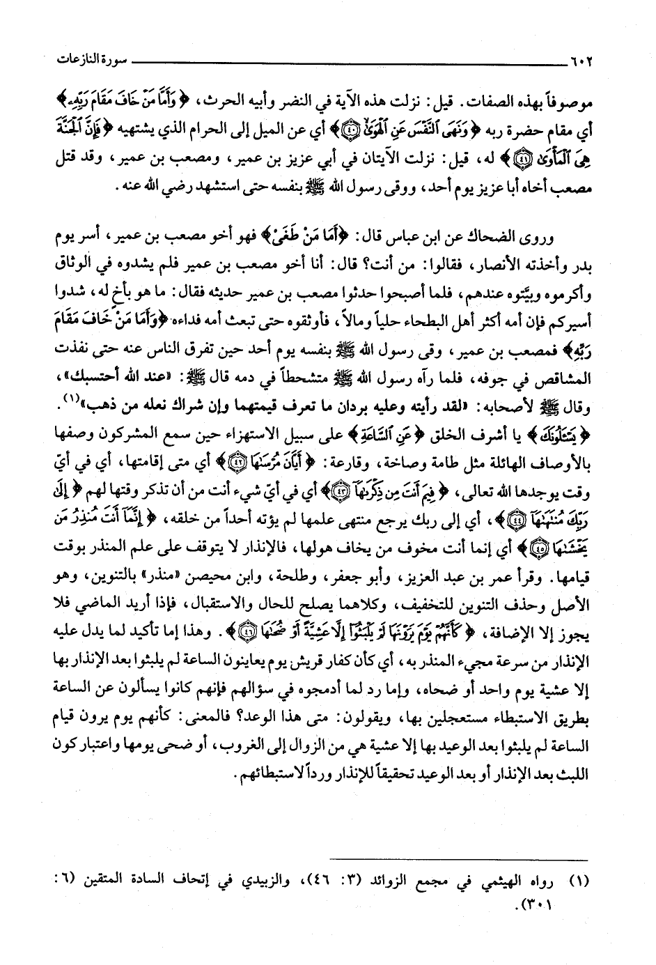 وروى الضحاك عن ابن عباس قال: فَأَمَّا مَنْ طَغى فهو أخو مصعب بن عمير، أسر يوم بدر وأخذته الأنصار، فقالوا: من أنت؟ قال: أنا أخو مصعب بن عمير فلم يشدوه في الوثاق وأكرموه وبيّتوه عندهم، فلما أصبحوا حدثوا مصعب بن عمير حديثه فقال: ما هو بأخ له، شدوا أسيركم فإن أمه أكثر أهل البطحاء حليا ومالا، فأوثقوه حتى تبعث أمه فداءه وَأَمَّا مَنْ خافَ مَقامَ رَبِّهِ فمصعب بن عمير، وقى رسول الله صلّى الله عليه وسلّم بنفسه يوم أحد حين تفرق الناس عنه حتى نفذت المشاقص في جوفه، فلما رآه رسول الله صلّى الله عليه وسلّم متشحطا في دمه قال صلّى الله عليه وسلّم: «عند الله أحتسبك» ، وقال صلّى الله عليه وسلّم لأصحابه: «لقد رأيته وعليه بردان ما تعرف قيمتهما وإن شراك نعله من ذهب»