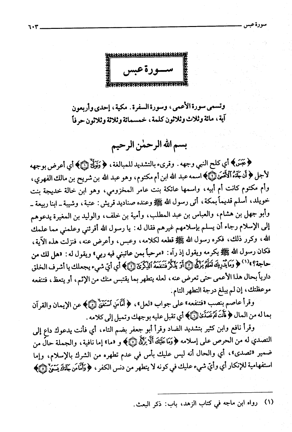 وتسمى سورة الأعمى، وسورة السفرة. مكية، إحدى وأربعون آية، مائة وثلاث وثلاثون كلمة، خمسمائة وثلاثة وثلاثون حرفا