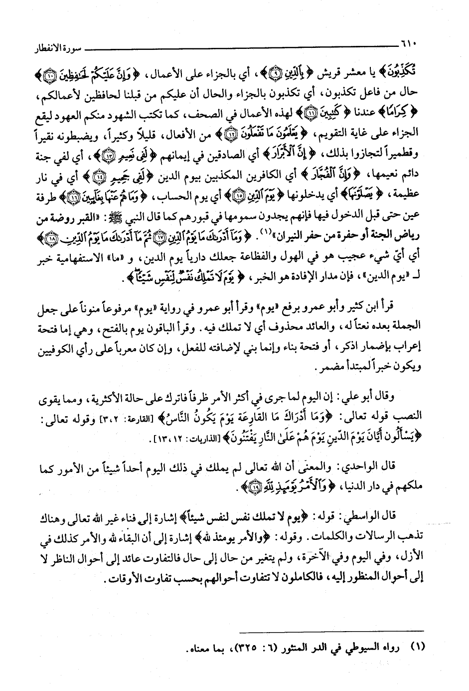«1» . وَما أَدْراكَ ما يَوْمُ الدِّينِ (17) ثُمَّ ما أَدْراكَ ما يَوْمُ الدِّينِ (18) أي أيّ شيء عجيب هو في الهول والفظاعة جعلك داريا يوم الدين، و «ما» الاستفهامية خبر ل «يوم الدين» ، فإن مدار الإفادة هو الخبر، يَوْمَ لا تَمْلِكُ نَفْسٌ لِنَفْسٍ شَيْئاً.