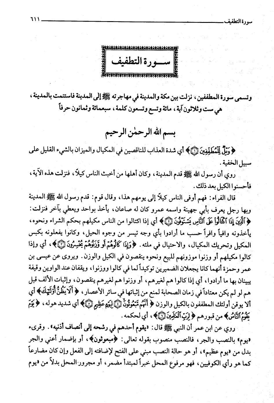 وتسمى سورة المطففين، نزلت بين مكة والمدينة في مهاجرته صلّى الله عليه وسلّم إلى المدينة فاستتمت بالمدينة، هي ست وثلاثون آية، مائة وتسع وتسعون كلمة، سبعمائة وثمانون حرفا